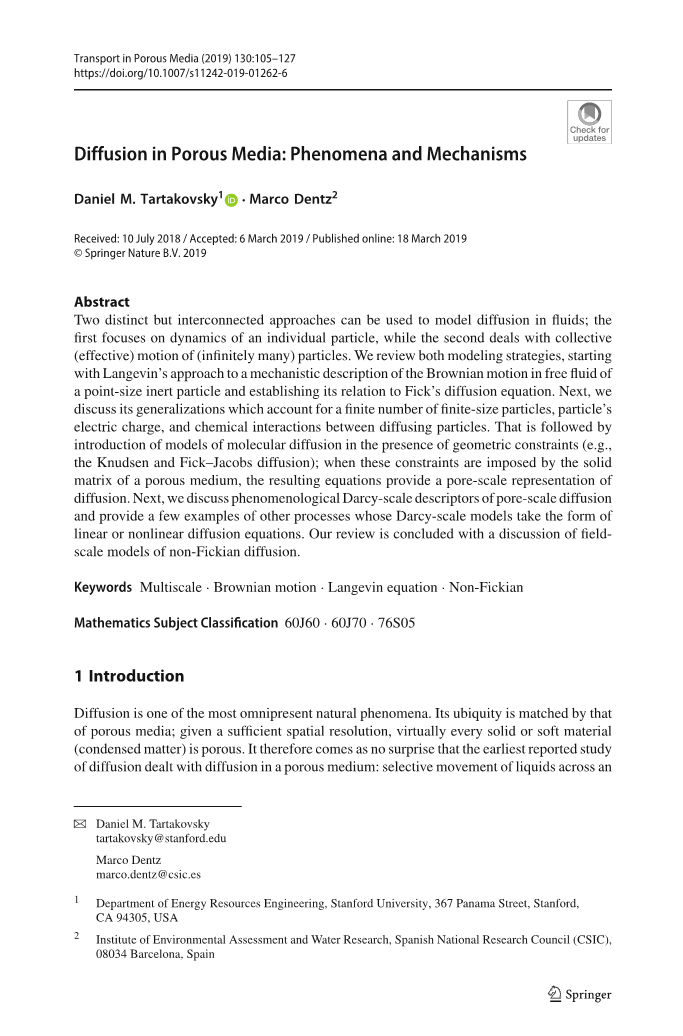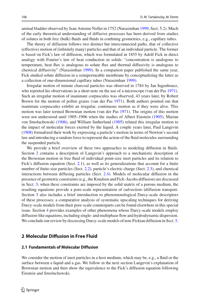 我们简要介绍了这两种流体扩散建模的方法。第2节包含Langevin对单个点大小的惰性粒子的自由流体中的布朗运动的力学描述及与菲克扩散方程的关系(2.1节)的描述,对有限数的概括,大小有限的粒子(2.2节)粒子的电荷(2.3节)以及扩散粒子之间的化学相互作用(2.4节)。在第3节中讨论了在存在几何约束(例如Knudsen和Fick-Jacobs扩散)的情况下的分子扩散模型,当这些约束条件是由多孔介质的固体基质施加时,所得方程将提供(对流-)扩散传输的孔隙尺度表示。第3节还简要介绍了这些过程的现象学达西尺度描述符,在本期特刊的其他部分可以找到对系统升级技术的比较分析,该技术可从其孔隙度对应物推导达西规模模型。第4节提供了其他现象的示例,这些现象的达西尺度模型采用类似于扩散的方程,包括单相和多相流以及流体动力扩散。第5节我们通过讨论达西尺度的非菲克扩散模型来结束。