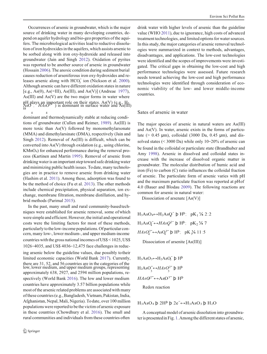 地下水是许多发展中国家的主要饮用水来源,地下水中砷的含量取决于含水层的水文学特征和含水层的生物地质特征。微生物活动导致氢氧化铁在含水层中的还原溶解,这有助于砷与羟基氧化铁一起被吸收并释放到地下水中.据报道,黄铁矿的氧化是地下水中砷的另一种来源.沉积物埋藏时的缺氧状况会导致砷氧化铁氢氧化物的还原,并与HCO-离子一起释放砷.尽管砷在自然界中可以具有不同的氧化态[例如,As(0),As(-III),As(III)和As(V)],As(III)和As(V)是水中的两种主要形式,pH对它们的状态起着非常重要的作用。As(V)(例如H2AsO在地表水和As(III)中占主导地位)具有显着的热力学稳定性,可减少还原条件。