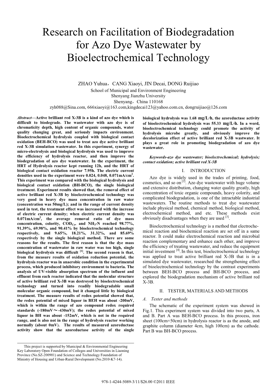 偶氮染料废水;生物电化学水解;接触氧化活性艳红X-3B.