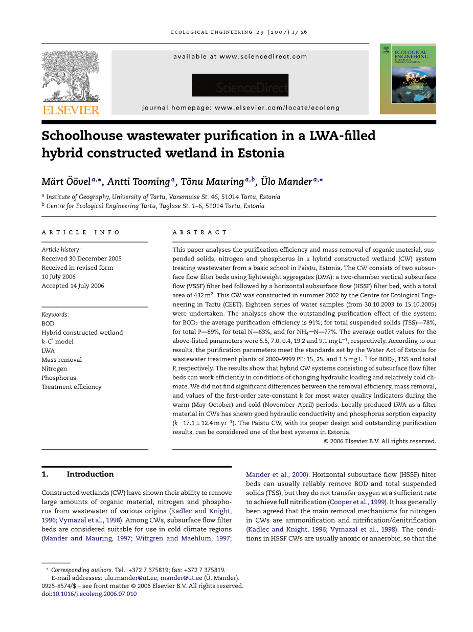 摘要:本文分析了爱沙尼亚·派斯图的一所基础学校的的污水在复合型人工湿地系统中有机物、悬浮物、氮、磷的净化效率和去除率。人工湿地系统由两座使用轻骨料的潜流滤床:一个二室垂直潜流滤床后跟水平潜流滤床,占地面积432平方米。在2002年夏天这个系统由塔尔图生态工程中心修建。从2003年10月30日到2005年10月15日承担了十八种水样品。分析表明该系统的净化效果显著:对于BOD7平均净化率为91%;总悬浮固体为78%,总磷为89 %,总氮63 %,而氨氮为77 %。对上述参数的平均出口值分别为5.5、7、0.4、19.2和9.1mg/l。根据我们的结果,净化指数达到了爱沙尼亚污水处理厂排放标准2000–9999 PE:BOD7,TSS和总磷分别为15,25,和1.5mg/l。结果表明,混合系统组成的地下水流滤床可以有效地工作在不断变化的水力负荷和相对寒冷的气候条件下。在温暖的(可能十月)和寒冷(十一月到四月)期间,我们没有发现在去除效率、质量去除、大多数水质指标的一级速率常数之间的显着差异。本地生产的轻质骨料在人工湿地系统中作为过滤材料已显示出良好的水力传导率和对磷的吸附能力(K = 17.1plusmn;12.4myrminus;1)。派斯图的复合型人工湿地系统,以其特有的设计和卓越的净化效果,可以认为是爱沙尼亚最好的系统之一。