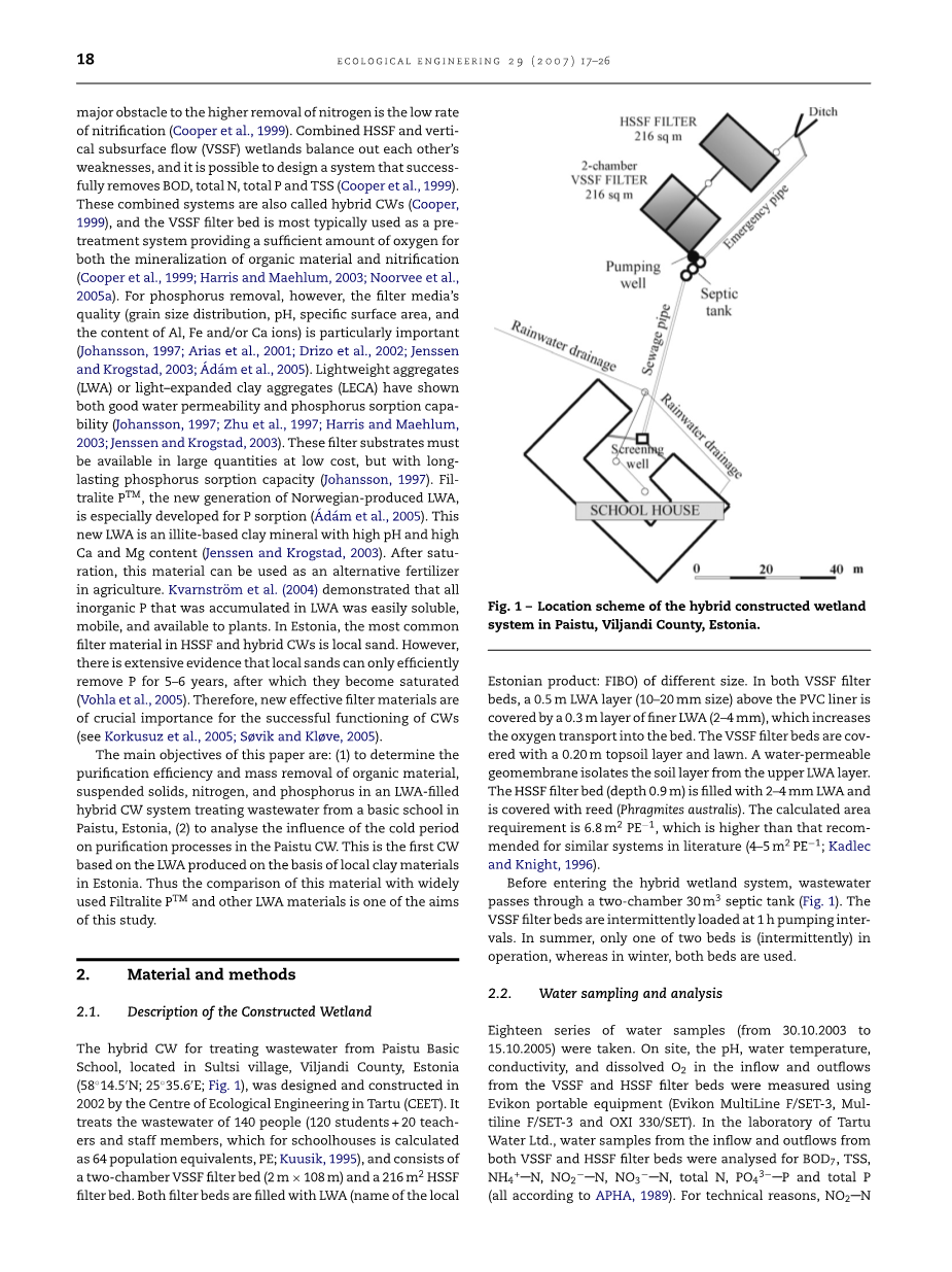 人工湿地已显示出其从不同来源的污水中去除大量的有机物质、氮和磷的能力。在人工湿地系统中,潜流滤床被认为是适用于寒冷地区的。水平潜流滤床通常可以可靠地去除BOD和总悬浮固体,但他们不能够以充足的速率来传输氧气从而达到完全硝化。人们普遍认为,氮在人工湿地系统中的主要去除机理是氨化和硝化/反硝化。在水平潜流条件下的人工湿地系统通常是缺氧或厌氧状态,更高的氮去除率的主要障碍是硝化率。结合水平潜流湿地和垂直潜流湿地并综合彼此之间的弱点,有可能设计一个系统能够成功地去除BOD、总氮、总磷和TSS。这些组合的系统仍然称为复合人工湿地系统,并且垂直潜流滤床通常是作为一个预处理系统用来为有机物矿化和硝化提供足够的氧气量。然而,对于磷的去除,过滤介质的质量(粒度分布,PH值,比表面积,和铝,铁和钙离子的含量)是特别重要的。轻骨料或光膨胀粘土骨料(陶粒)已经显示出了良好的渗透性和对磷的吸附能力。这些过滤基层必须以较低的成本大量可用,并且对磷有持久的吸附能力。挪威产的新一代的轻质骨料PTM滤料,主要是为磷的吸收而发展出来的。这种新的轻质骨料是一种以伊利石为主的粘土矿物,并且有高pH值和高含量的钙和镁。在饱和后,这种材料可以作为一种替代肥料在农业上使用。等人在2004年表明,在轻质骨料中积累的所有无机磷具有易溶性、流动性并且可供植物使用。在爱沙尼亚,在水平潜流复合人工湿地系统中最常用的过滤材料是本地的沙子。然而,有广泛的证据表明,当地的沙子只能在5 - 6年内有效地去除磷,5-6年之后他们就会饱和。因此,新型过滤材料对人工湿地系统的成功运作是非常重要的。
