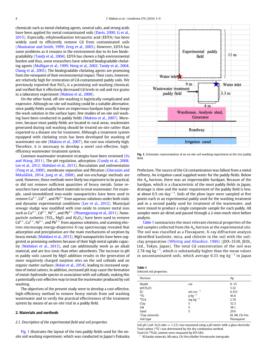 萃取剂,它们的可生物降解的螯合剂是有前途的。然而,他们的成本是比较高的镉污染的水稻田的恢复。我们之前报道的一项实验,FeCl3是一种很有效的土壤清洗化学试剂,实验验证,它有效地减少土壤和水稻籽粒Cd含量。另一方面,场外清洗是非常复杂和昂贵的,因为稻田里通常有一个不透水的砂砾层,使洗涤液在表面层,现场土壤清洗非常有效,使得现场土壤清洗的相关研究已经在稻田里进行。此外,由于大多数水田都位于农村地区,在土壤清洗过程中产生的废水应处理现场,而不是出口到一个遥远的现场处理。虽然治疗系统配备的螯合树脂已用于废水现场清洗(牧野et al.,2007),成本是比较高的。因此,有必要开发一种新的成本效益,高效率的污水处理系统。综述了常用的废水处理策略 ,常用的有pH调节、吸附、絮凝沉淀、膜分离、过滤和离子交换。然而这些方法实行起来太贵了,或者不能去除重金属的效果不好,导致无法实行。一些研究人员开始用吸附剂处理废水,例如,砂固定氧化铁纳米粒子已被用于去除Cu2 、Cd2 、Pb2 溶液在静态和动态的条件下。城市污水污泥改性铁氧化物去除金属离子Cu2 、Cd2 、Ni2 、Pb2,纳米颗粒吸附剂(TiO2、MgO、Al2O3)已被用于去除Cd2 、Cu2 、Ni2 、Pb2 溶液中,用扫描电子显微镜和X射线能量色散谱可以看出吸附和沉淀的重金属吸附的主要机制。纳米MgO颗粒被认为是有前途的吸附剂由于其高金属的吸收能力(Mahdavi et al.,2013),并且还可以作为碱性物质,并且比其他吸附剂毒性较小。在水稻土中的PH值的增加引起的氧化镁,此外结果在产生更多的负电荷的吸附位点的土壤胶体和有机物表面,导致增加吸附金属阳离子。此外,增加的PH值可能会导致金属-氢氧化物的形成与土壤胶体的形成,这是一个潜在的成本效益的方式来处理的废水产生的土壤清洗。