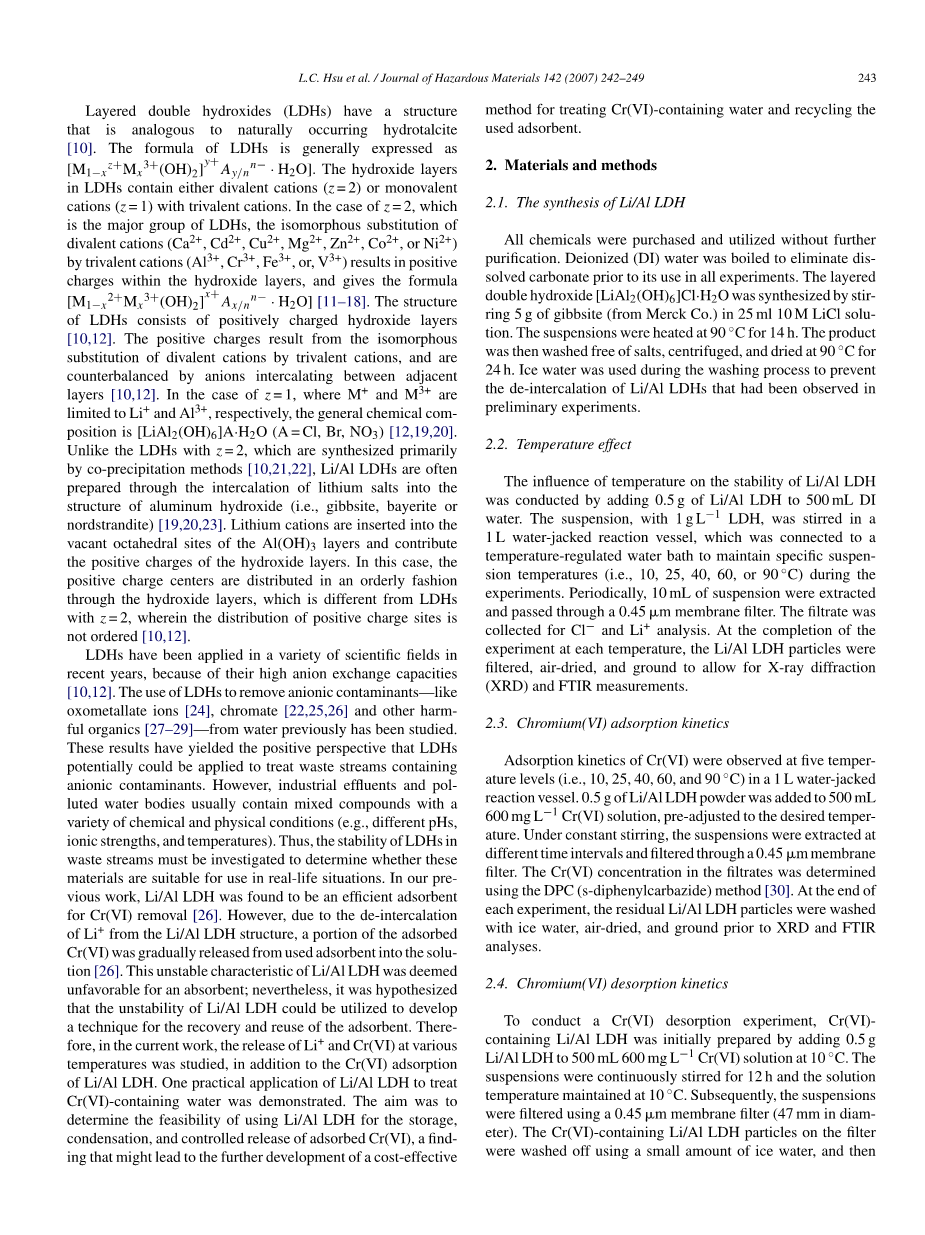 为了实施六价铬的解吸实验,首先将0.5gLi/Al LDH在10℃下加入到500ml 600mg/l的六价铬溶液中以得到含六价铬的Li/Al LDH。悬浮液被持续搅拌12h并且溶液温度保持在10℃。随后,用0.45mu;m的膜过滤器(直径47mm)过滤悬浮液。过滤器上的含六价铬Li/Al LDH的颗粒用少量冰水洗净,然后立即转移到以预调好温度(10,25,40,60或90℃)的去离子水中。搅拌悬浮液,一段时间后提取,然后用0.45mu;m膜过滤器过滤以收集滤液。滤液中六价铬浓度采用DPC方法分析并记录为时间的函数。在解吸实验所选择的时间当中,Li/Al LDH固体过滤后被收集起来并做XRD和FITR分析。