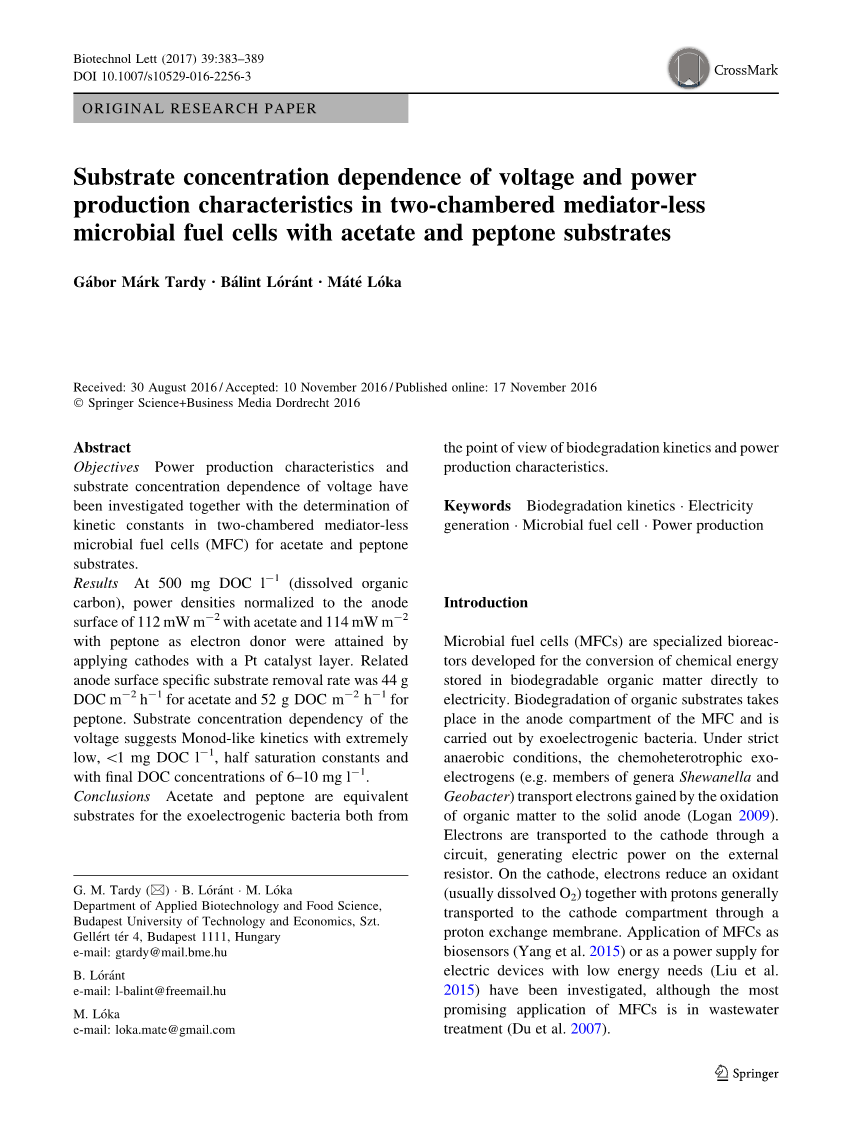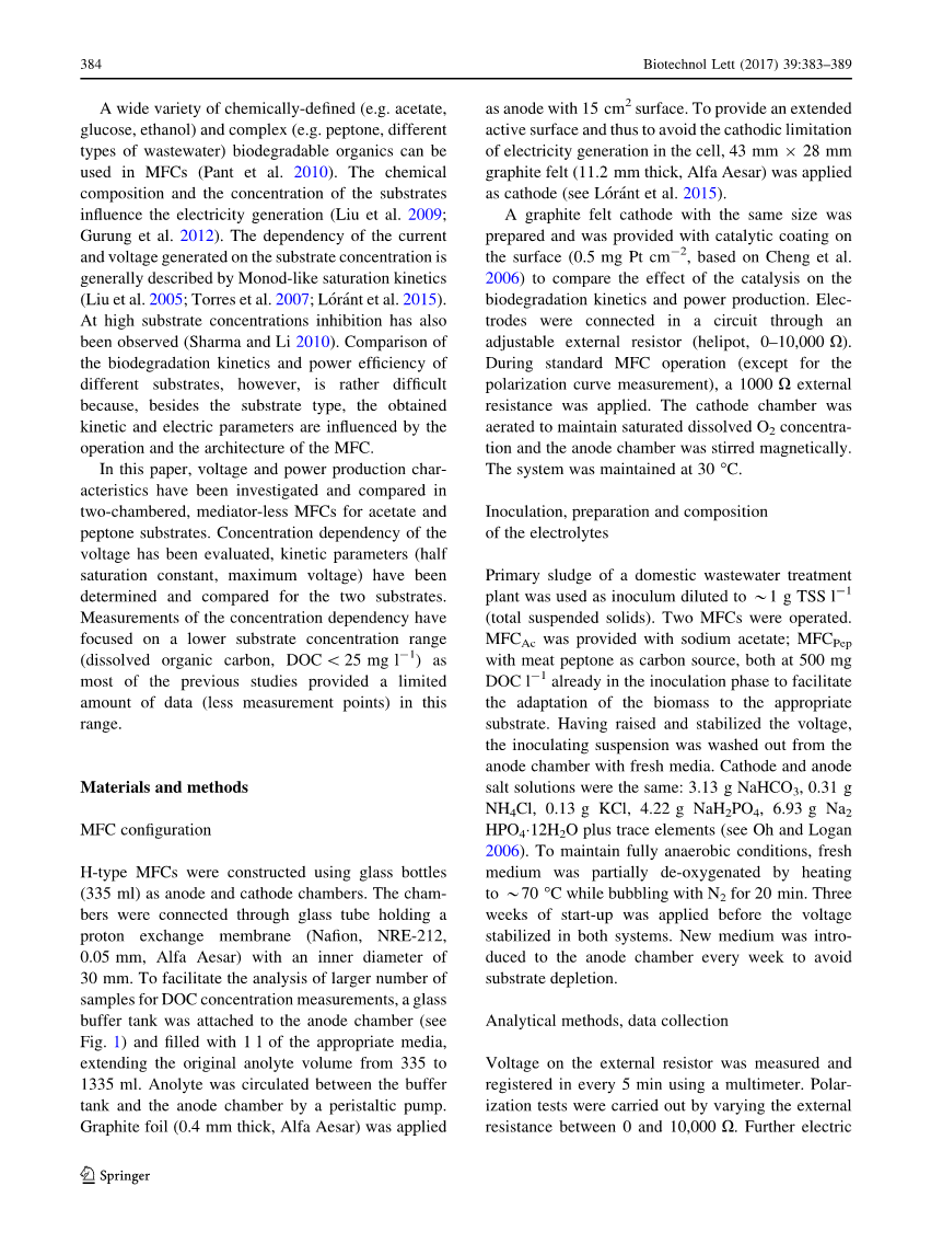 MFC中可以使用各种各样的化学成分明确(例如乙酸盐,葡萄糖,乙醇)和复杂的(例如蛋白胨,不同类型的废水)可生物降解有机物(Pant et al. 2010)。底物的化学成分和浓度影响发电能力(刘某等。2009; Gurung等人。2012)。生成的电流和电压对底物浓度的依赖性通常可以用类莫诺方程的饱和动力学描述(刘某等人2005; Torres等人2007; Loacute;raacute;nt等人。2015)。高底物浓度抑制MFC性能也被发现(Sharma和李某等人。2010)。 然而,不同底物的生物降解动力学和产电能力的比较是相当困难的,因为除了底物类型之外,所获得的动力学和电学参数受到MFC的操作和结构的影响。