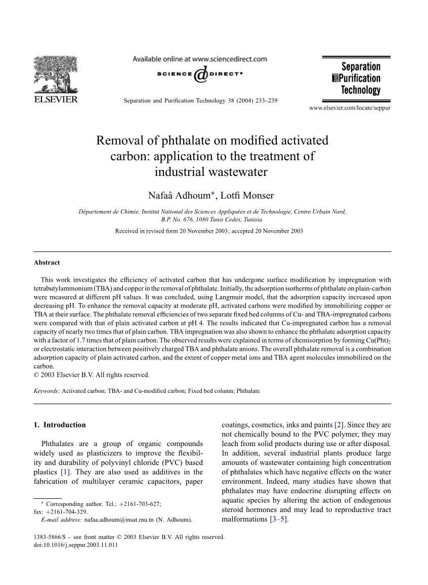 改性活性炭对邻苯二甲酸的去除: 在工业 废水处理中的应用外文翻译资料