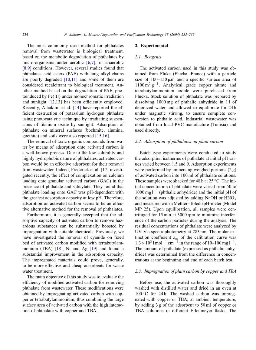 摘要:本文研究了用四丁基铵(TBA)和铜浸渍改性后的活性炭对邻苯二甲酸的吸附效率,初步测定了不同pH值下邻苯二甲酸在普通炭上的吸附等温线,用Langmuir模型得出吸附容量随pH值的降低而增加,以提高中等pH值时的去除能力,通过固定铜或TBA对活性炭进行改性。在pH值为4时,比较了两种不同固定床交换柱对Cu-和TBA-浸渍炭的邻苯二甲酸根的去除率,结果表明,铜浸渍炭对邻苯二甲酸的去除能力是普通碳的近两倍。TBA浸渍可使邻苯二甲酸的吸附能力提高1.7倍,通过形成Cu(Pht)2或正带电荷的TBA与邻苯二甲酸根的静电相互作用来解释实验结果,邻苯二甲酸的整体去除是普通活性炭的复合吸附以及铜金属离子和TBA试剂分子固定在活性炭上的程度。