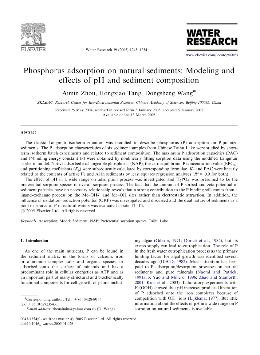 在自然沉积物磷吸附:建模和pH值和沉积物组成物的影响外文翻译资料