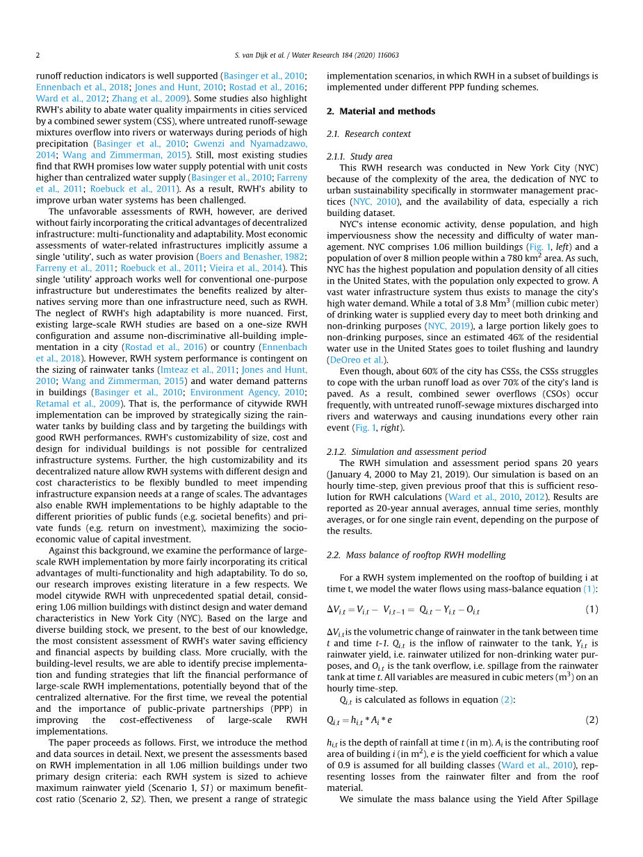 然而,对雨水收集系统不利的评估是在没有公平地考虑分散式基础设施的关键优势:多功能和适应性的情况下得出的。大多数与水有关的基础设施的经济评估都隐含地假定了一个单一的“公用事业”,例如供水(Boers和Benasher,1982;Farreny等,2011;Roebuck等人,2011;维埃拉等人,2014)。这种单一的“效用”方法对传统的单一用途基础设施很有效,但低估了服务于多个基础设施需求的替代方案(如雨水收集系统)所实现的好处。对于雨水收集系统的高适应性的忽视更加微妙。首先,现有的大规模雨水收集系统研究基于单一尺寸的雨水收集系统配置,并假定在城市(Rostadetal,2016)或国家(enenbachetal,2018)无差别地实现全建筑。然而,雨水收集系统的性能取决于雨水池的大小(Imteaz等人,2011;琼斯与亨特,2010;Wang and Zimmerman,2015)和建筑需水模式(Basingeretal,2010;环境局,2010;Retamal等,2009)。也就是说,城市范围内雨水收集系统实施的性能可以通过根据建筑类别和针对具有良好雨水收集系统性能的建筑的策略来提高雨水池的大小。雨水收集系统对单个建筑的尺寸、成本和设计的可定制性在集中式基础设施系统中是不可能实现的。此外,其高度的可定制性和分散性允许具有不同设计和成本特征的雨水收集系统灵活联系,以满足各种规模的基础设施扩展需求。这些优点还使雨水收集系统的实施能够高度适应公共基金(如社会利益)和私人基金(如投资回报)的不同优先事项,最大限度地提高资本投资的社会经济价值。