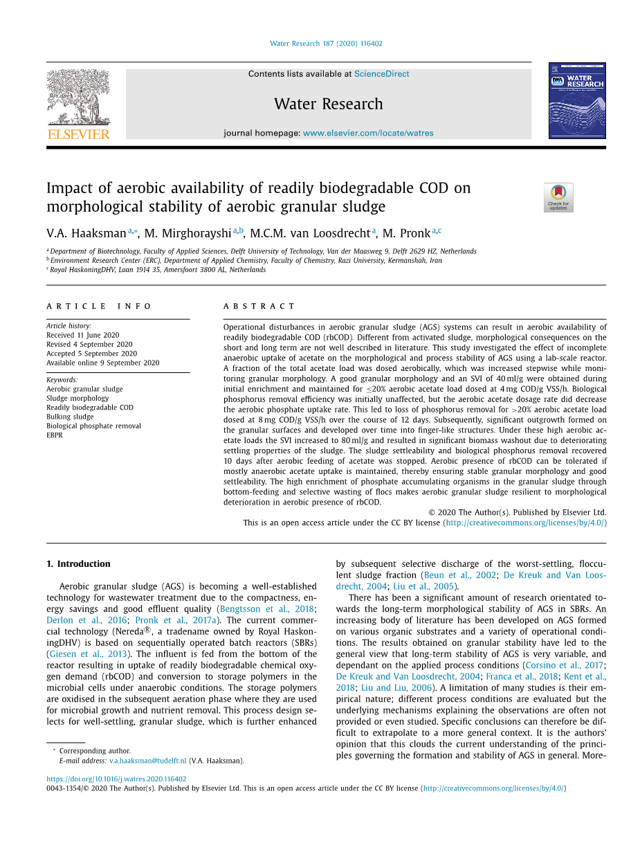 好氧颗粒污泥(AGS)由于其紧凑性、节能性和良好的出水水质,正在成为一种成熟的废水处理技术(Bengtsson et al.,2018;Derlon et al.,2016;Pronk et al.,2017a)。当前的商业技术(内雷达),Royal Haskon-ingDHV拥有的商标名)基于顺序操作间歇式反应器(SBR)(Giesen等人,2013)。进水来自反应器底部,导致易生物降解的化学需氧量(rbCOD)的吸收,并在厌氧条件下转化为微生物细胞中的储存聚合物。储存聚合物在随后的曝气阶段被氧化,用于微生物生长和养分去除。该工艺设计选择了沉降良好的颗粒污泥,进一步增强了颗粒污泥的稳定性。