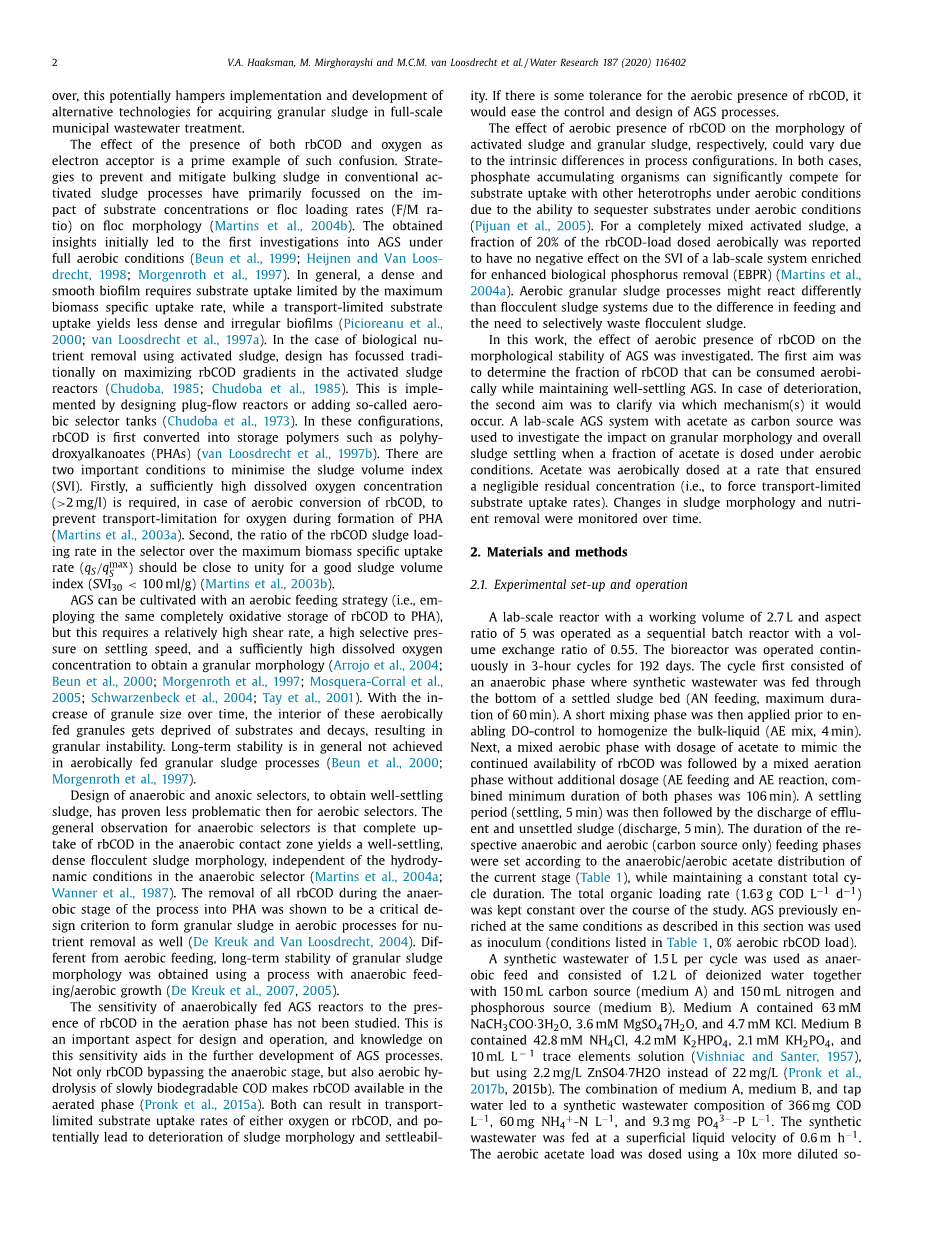 有大量的研究致力于AGS在SBR中的长期形态稳定性。关于在各种有机基质和各种操作条件下形成的AGS的文献越来越多。颗粒稳定性的研究结果表明,AGS的长期稳定性是非常可变的,并且取决于应用的工艺条件(Corsino etal.,2017;De Kreuk and Van Loosdrecht,2004;Francaetal.,2018;Kentetal.,2018;Liu and Liu,2006)。许多研究的一个局限性是它们的理论性质;对不同的工艺条件进行了评估,但往往没有提供甚至没有研究解释观察结果的潜在机制。因此,很难将具体结论外推到更一般的情况下。作者认为,这给目前对AGS形成和稳定性的基本原理的理解蒙上了一层阴影。此外,这可能会阻碍在大规模城市污水处理中获得颗粒污泥的替代技术的实施和发展。