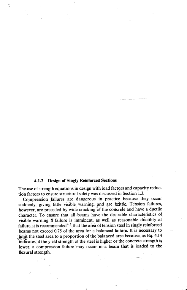 在实际中受压破坏是危险的,因为它突然发生,几乎没有明显的警告,并且是脆性破坏。然而,受拉破坏发生前混凝土会出现较大裂缝,并有延性特征。为确保所有的梁在破坏即将发生前,具有可视化警告的理想特征,并且在破坏时有合理的延性,建议4.2单筋受弯构件的受拉钢筋面积不超过发生极限破坏时(还是适筋破坏?与现有本科教材对标下)钢筋面积的0.75。有必要限制钢筋面积与发生极限破坏时钢筋面积的比例,如式4.14所示,如果钢的屈服强度较高或混凝土强度较低,则加载到抗弯强度的梁可能发生受压破坏。