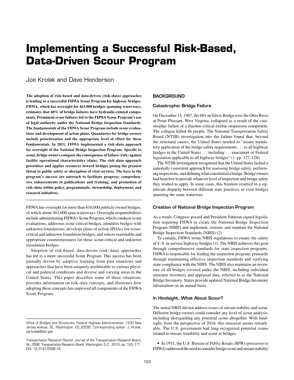 1967年12月15日,西维吉尼亚州俄亥俄河上的681米高的银桥,由于断裂关键的眼杆悬吊部件的灾难性故障而垮塌。地震造成46人死亡。美国国家运输安全委员会(NTSB)对事故的调查发现,除了结构性原因外,美国还有其他原因需要“保证强制实施桥梁安全要求hellip;”所有的高速公路美国的桥梁hellip;包括hellip;hellip;制定的联邦适用于所有公路桥的立法”(1,第127-128页)。
