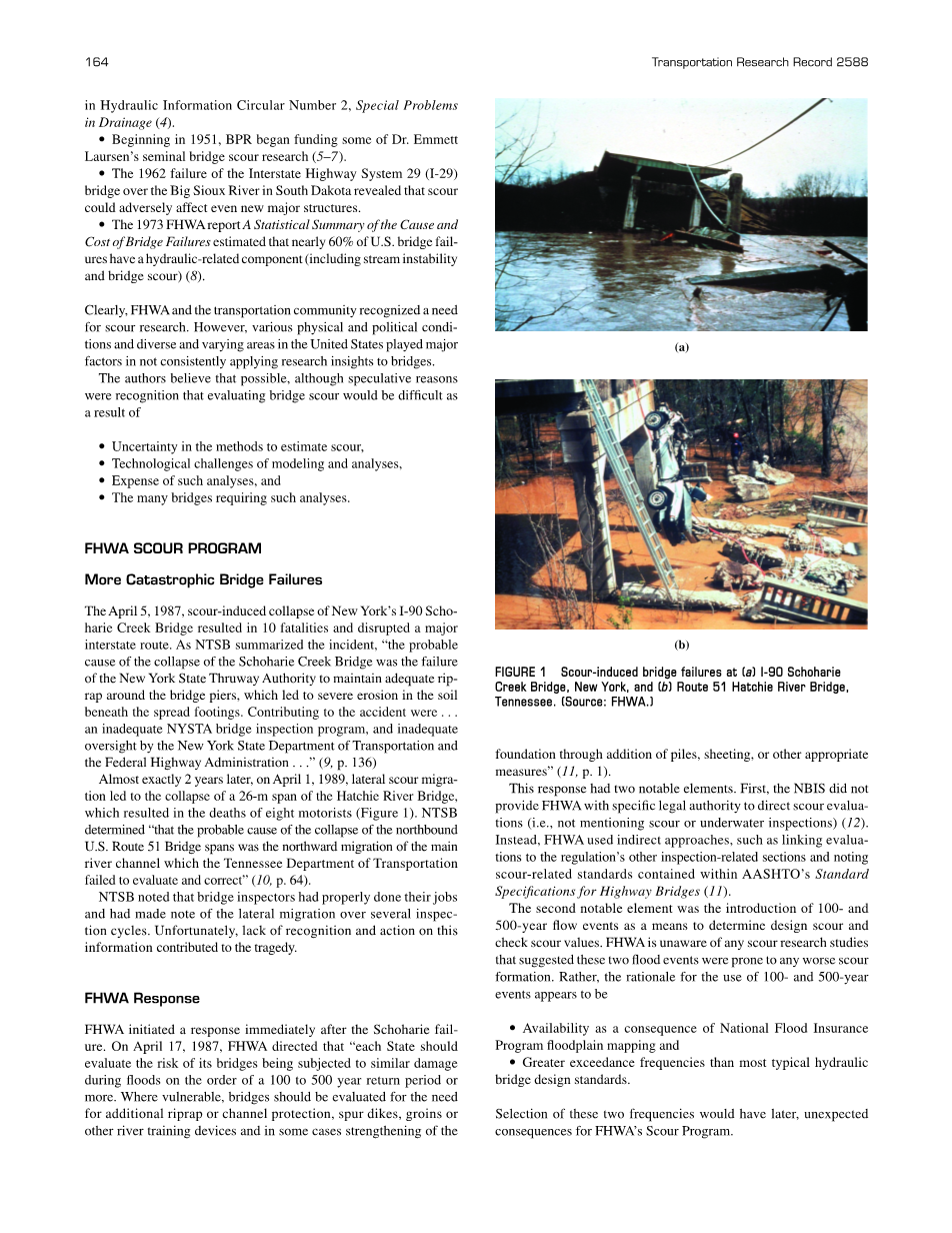 1987年5月20日,仍在响应Schoharie的失败,FHWA让埃弗里特·理查森医生开始准备一份技术报告谘询(电讯局长),为桥梁业主提供有关scour的主体(FHWA,内部义务备忘录)。