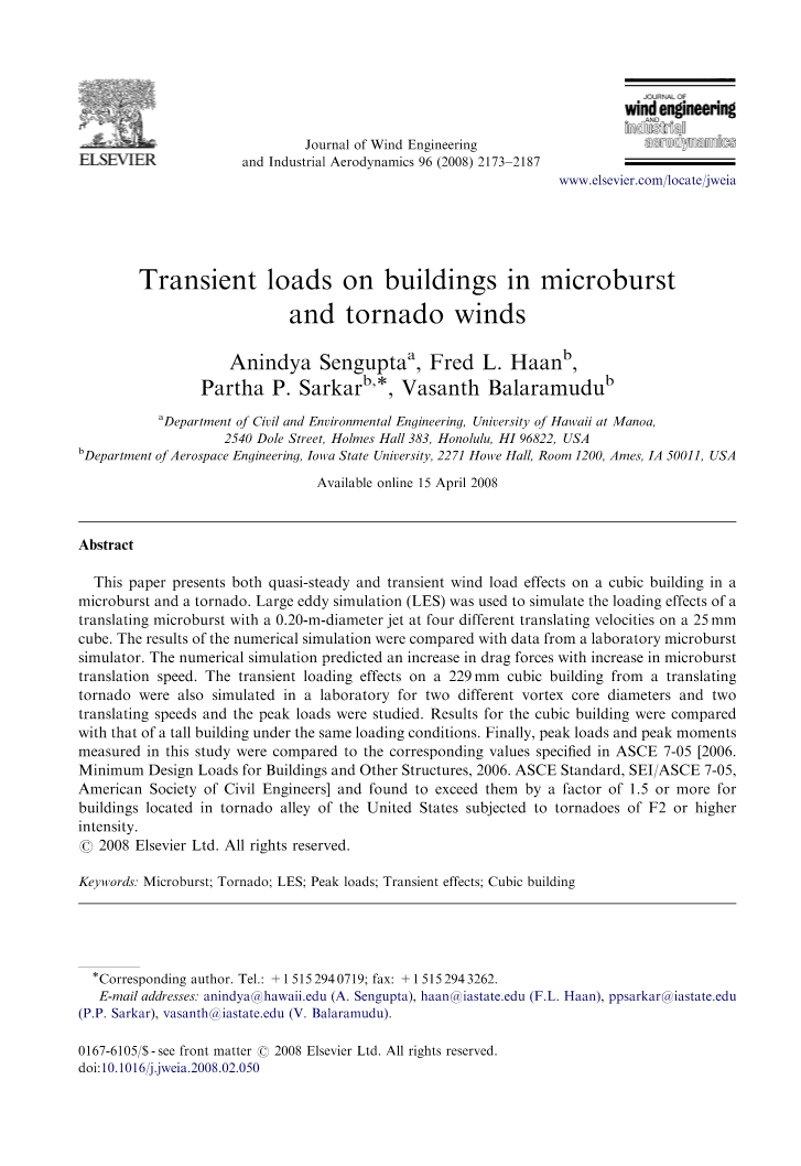 本论文介绍了微下击暴流和龙卷风对立方体建筑的准稳态和瞬态风荷载效应。大涡模拟(LES)被用来模拟微下击暴流的负载效应,具体做法是用直径0.20m喷嘴来对边长25mm的立方体产生四个不同方向的平移速度。数值模拟的结果与实验室微暴模拟器数据进行了比较。数值模拟预测了阻力随着微暴平移速度增加而增大。移动龙卷风作用在边长229毫米立方体上的瞬态负载的影响也被针对对两种不同涡流核心直径以及两个平移速度在实验室中进行了模拟,此外也研究了峰值载荷。立方体建筑的结果被拿来与相同载荷条件下的高层建筑进行了比较。最后,在这项研究中测得的峰值负载和峰值时刻被用来与ASCE7-05标准中的相应值进行了比较 [2006.建筑物及其他构筑物的最小设计荷载,2006.ASCE标准,SEI/ ASCE7-05,美国土木工程师学会],并发现对于位于美国龙卷风通道而经常遭受F2或更高的龙卷风强度的的建筑,结果以1.5以上的倍数超过了标准值。