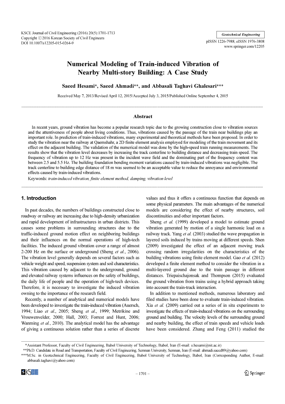 近年来,随着振源附近建筑的日益增加以及人们对居住环境关注的提高,地面振动已经成为热门的研究话题。于是,建筑周边车致振动起到了重要作用。在车致振动预测中,已提出许多实际和理论方法,为研究Qaemshahr地区的铁路振动,采用一种2D有限元分析方法研究列车运动建模级振动对周边建筑的影响。数值模型的合理性已在高速列车的实际运行中被证实,结果表明:振动水平随轨道中心线距建筑地区距离的增加以及列车速度的减小而减小。入射波场振动频率最高达12HZ,频谱主频率在2.5到5.5HZ之间,在建筑基础区域车致振动引起的弯矩变化是可忽略的,轨道中心线距离建筑周边地区18M的地方被视为减小车致振动引起的干扰和环境影响的允许值。