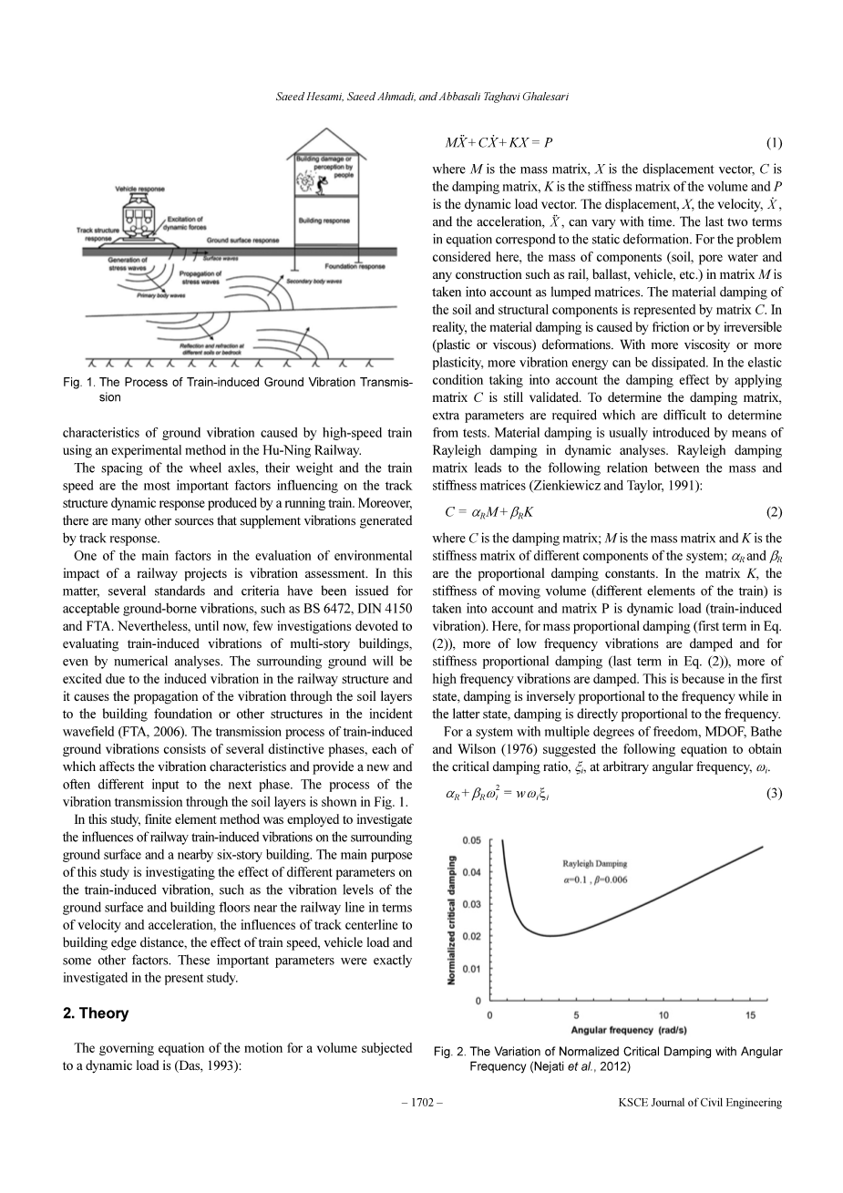动力荷载下体积的方程式为(Das,1993)。M是质量矩阵,X是位移矢量,C是阻尼矩阵,K是体积的刚度矩阵,P是动力荷载矢量。X是位移是速度是加速度,他们均随时间变化。方程式最后两个术语与静态变形有关。基于在此考虑的问题,M的组成部分(土,纯净水,以及其结构比如说铁轨,道渣,车辆等)被视为分块矩阵,土的阻尼和结构组成由矩阵C表示。事实上,材料阻尼是由摩擦和不可逆的变形(塑性和粘性)组成。随着塑性和粘性的增加,振动能量会逐渐减小。在矩阵C中,考虑弹性因素也是合理的。为确定阻尼矩阵,从实验中获得参数则更加困难。在动力分析中的Rayleigh阻尼法中,材料阻尼通常会考虑在内。Rayleigh矩阵在质量矩阵和刚度矩阵中建立了联系。(Zienkiewicz和Tayor,1991),C为阻尼矩阵,M为质量矩阵,K是系统中不同组成的刚度矩阵,和为比例阻尼常数。矩阵K中,考虑了移动的体积刚度(不同列车元素),矩阵P为动力荷载(车致振动),对于质量比例阻尼(方程二中的第一个术语),低频振动被更多的抑制。对于刚度比例阻尼,高频振动被更多的抑制。这是因为在第一次的表述中,阻尼和频率成反比。在第二次的表述中,二者成正比。