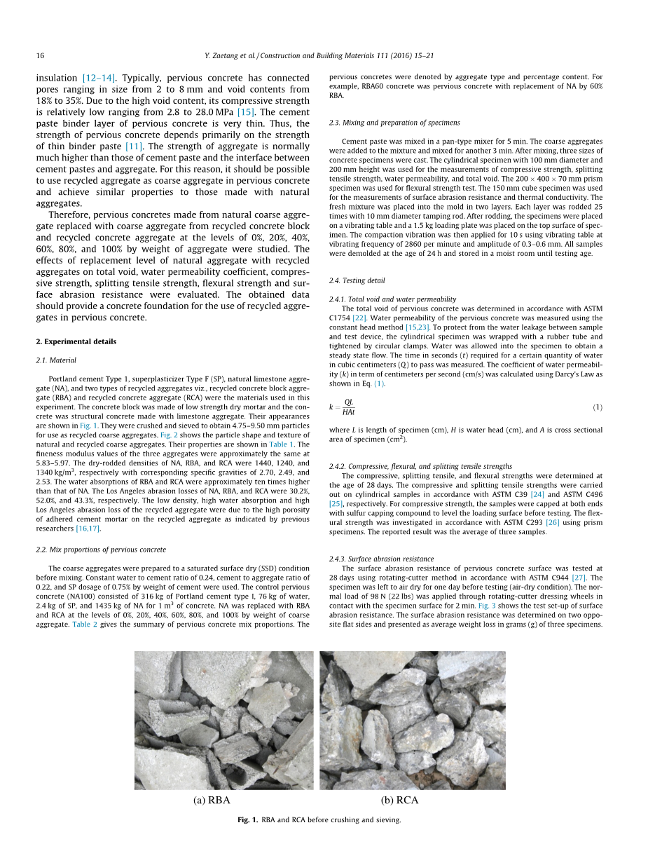 混合前粗骨料被制备成饱和的面干(SSD)状态。水与水泥的比例0.24,水泥的骨料比0.22,0.75%的水泥重量的SP剂量被使用。一立方米天然透水混凝土(NA100)由316千克硅酸盐水泥I型,76公斤水,2.4公斤SP,1435千克NA组成的。分别用0%,20%,40%,60%,80%和100%的重量水平RBA和RCA的粗骨料取代NA。表2给出了透水混凝土配合比的总结。透水混凝土是由聚合类型和百分含量表示。例如,RBA60混凝土是更换60%NA的RBA透水混凝土。