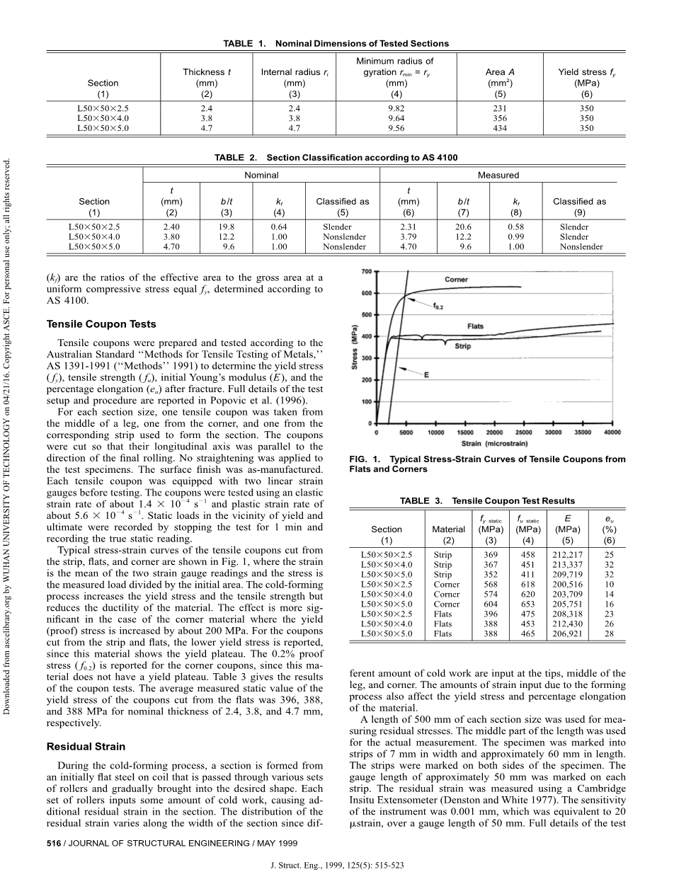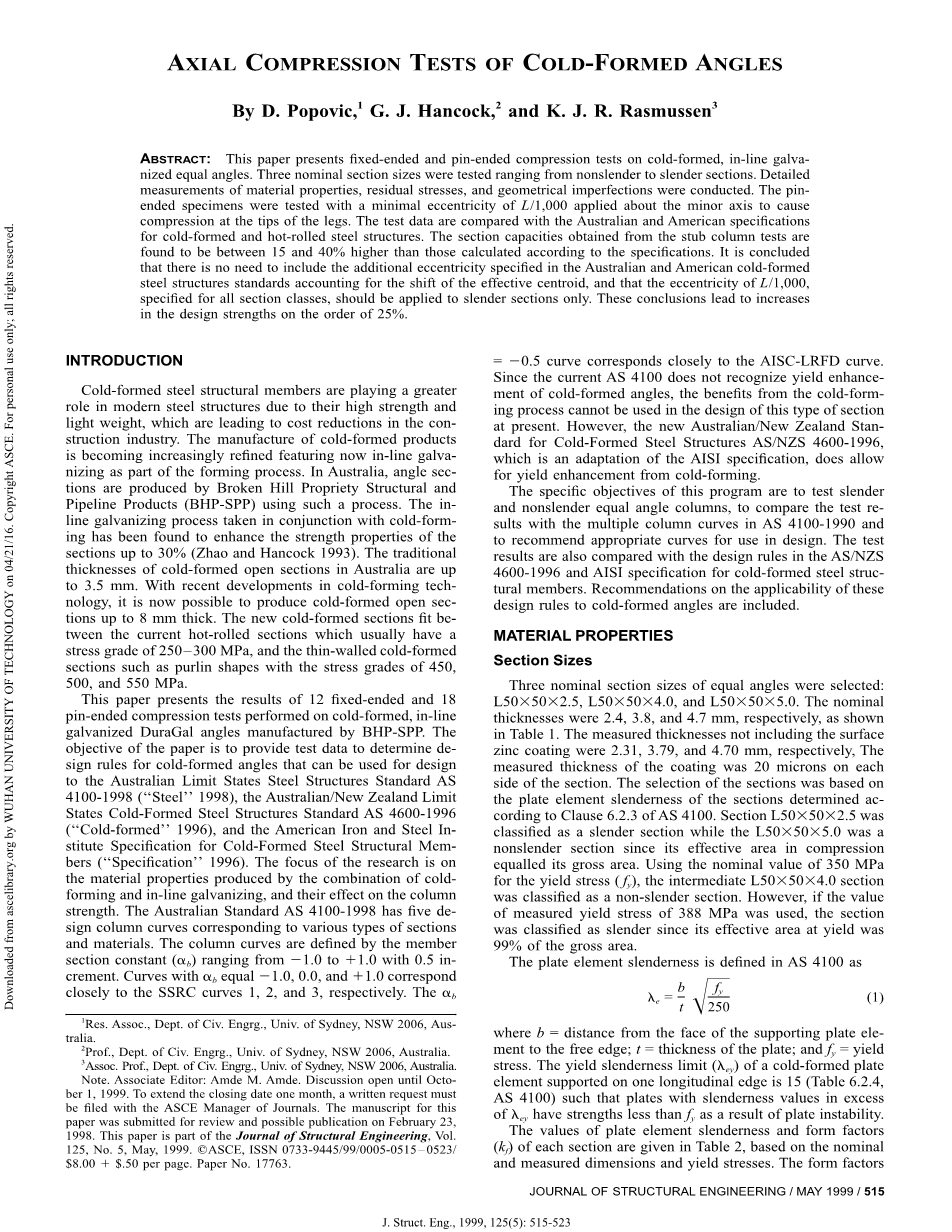 本文介绍了冷弯内嵌镀锌等边角钢分别在固定端和简支端情况下的压缩试验。从非细长截面到细长截面,对三种名义尺寸的截面进行了试验。并且对它们的材料特性,残余应力以及几何缺陷进行了详细的测量。在测试时,对简支端的样本施加了具有最小偏心距的偏心荷载,偏心距为L/1000,施加于短轴上,从而引起角肢尖端的压缩。将此次试验的数据与澳大利亚还有美国关于冷弯、热轧钢构件的规范相比较。通过试验我们发现,由短柱试验测量得到的截面承载能力比根据规范公式计算得到的承载能力高15%到40%。通过这个得到的结论是,没有必要在澳大利亚和美国关于冷弯钢构件的规范标准的基础上,考虑导致有效质心产生偏移的附加偏心距。同时,对所有等级的截面施加的L/1000的偏心距,应当仅仅施加于细长截面上。这些结论使得规范中的设计强度提高了25%。