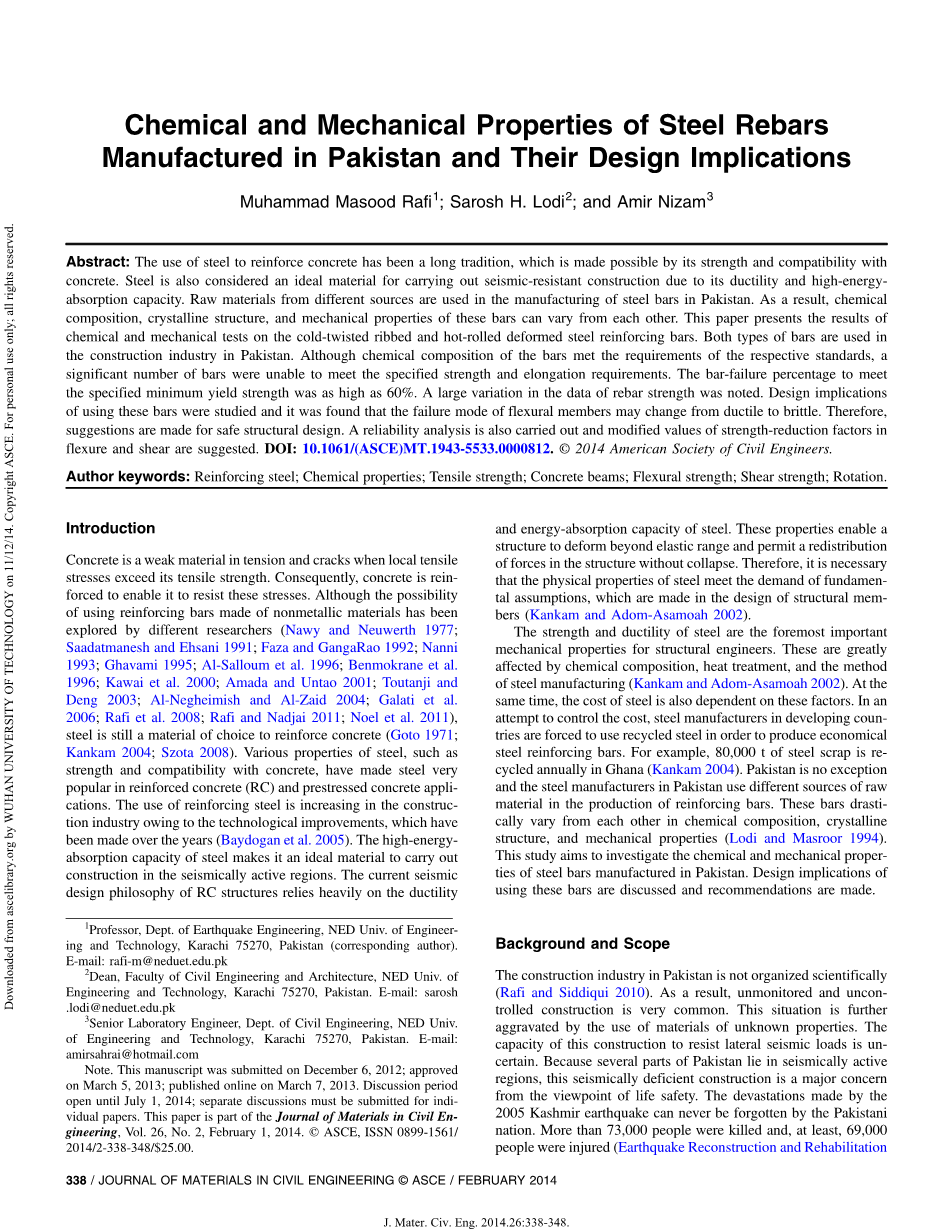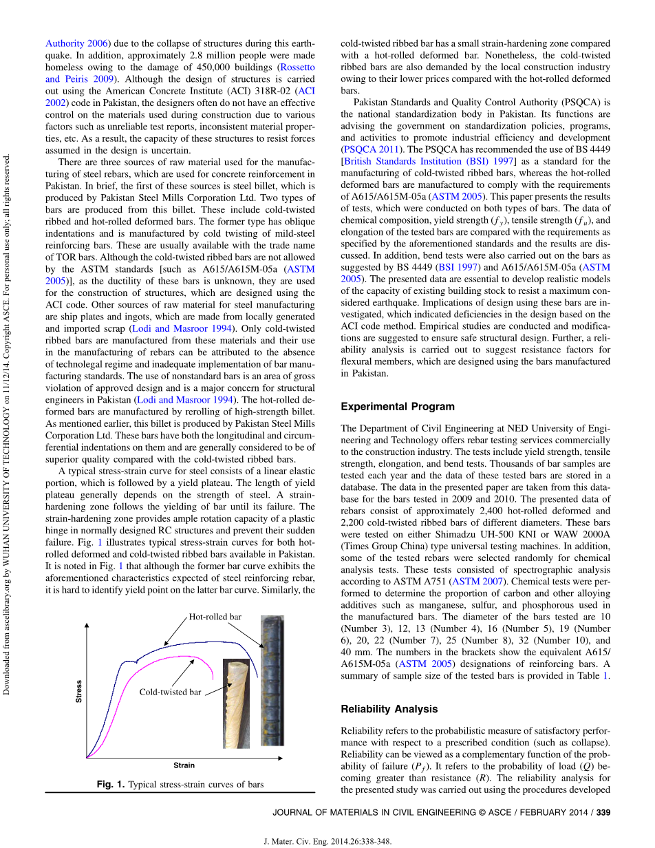 摘要:钢筋通过强度和与混凝土的相容性使其在混凝土中有着长久的应用。由于钢筋具有延性和高能量吸收能力,被认为是理想的抗震建筑材料。不同来源的原材料在巴基斯坦的钢筋制造中使用,使得这些钢筋的化学成分、晶体结构和力学性能可能彼此不同。本文介绍了冷轧带肋钢筋和热轧变形钢筋的化学和力学性能试验结果。这两种钢筋都在巴基斯坦的建筑工业中使用。尽管钢筋的化学成分符合各自标准的要求,但仍有大量的钢筋无法满足规定的强度和伸长率要求。钢筋不能满足最低屈服强度要求的百分率高达60% ,并且钢筋强度数据的变化很大。研究了使用这些钢筋的设计意义,发现弯曲构件的破坏模式可能由延性破坏转变为脆性破坏。因此,提出了安全结构设计的建议。并进行了可靠性分析,提出了抗弯强度和抗剪强度的折减系数修正值。工业部:10.1061/ (美国土木工程师学会) )MT.1943-5533.0000812。2014年美国土木工程师学会。