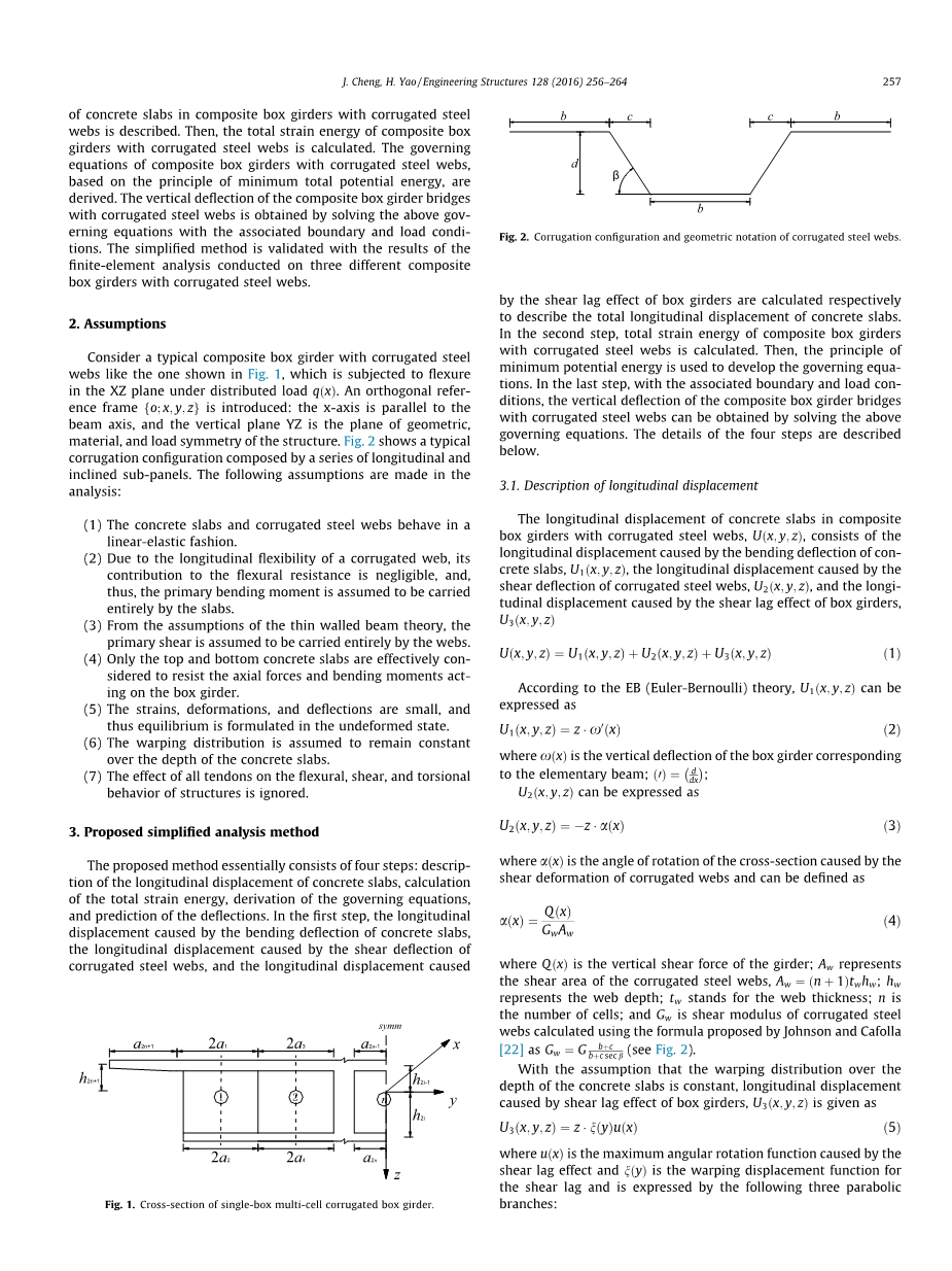 所提出的方法基本上包括四个步骤:混凝土板纵向位移的描述,总应变能的计算,控制方程的推导,和挠度的预测。在第一步中,通过混凝土板的弯曲变形引起的纵向位移,由波纹钢腹板变形引起的纵向位移和箱梁的剪力滞效应引起的纵向位移分别计算引起混凝土板的总纵向位移。在第二步骤中,计算波形钢腹板复合箱梁的总应变能。然后,利用最小势能原理开发控制方程。最后,结合相关的边界条件和荷载条件,通过求解上述控制方程,得到波纹钢腹板组合箱梁桥的竖向挠度。以下是四个步骤的细节描述: