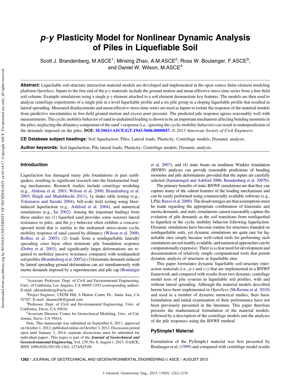 作者关键词:土壤液化; 桩横向载荷; 可塑性; 离心模型; 动态分析。
