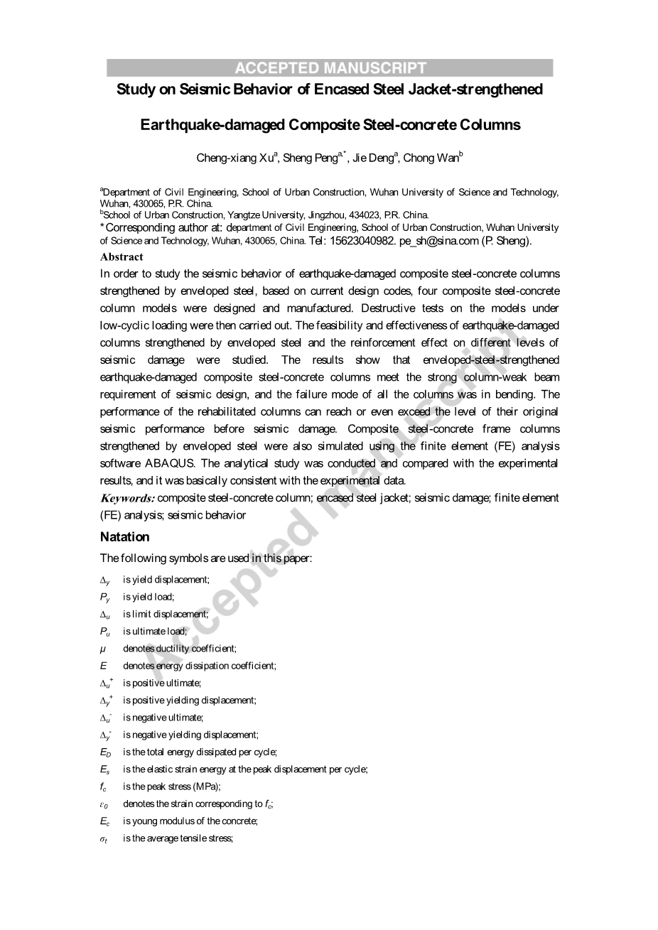 围护套加固地震损伤钢筋混凝土组合柱抗震性能研究外文翻译资料