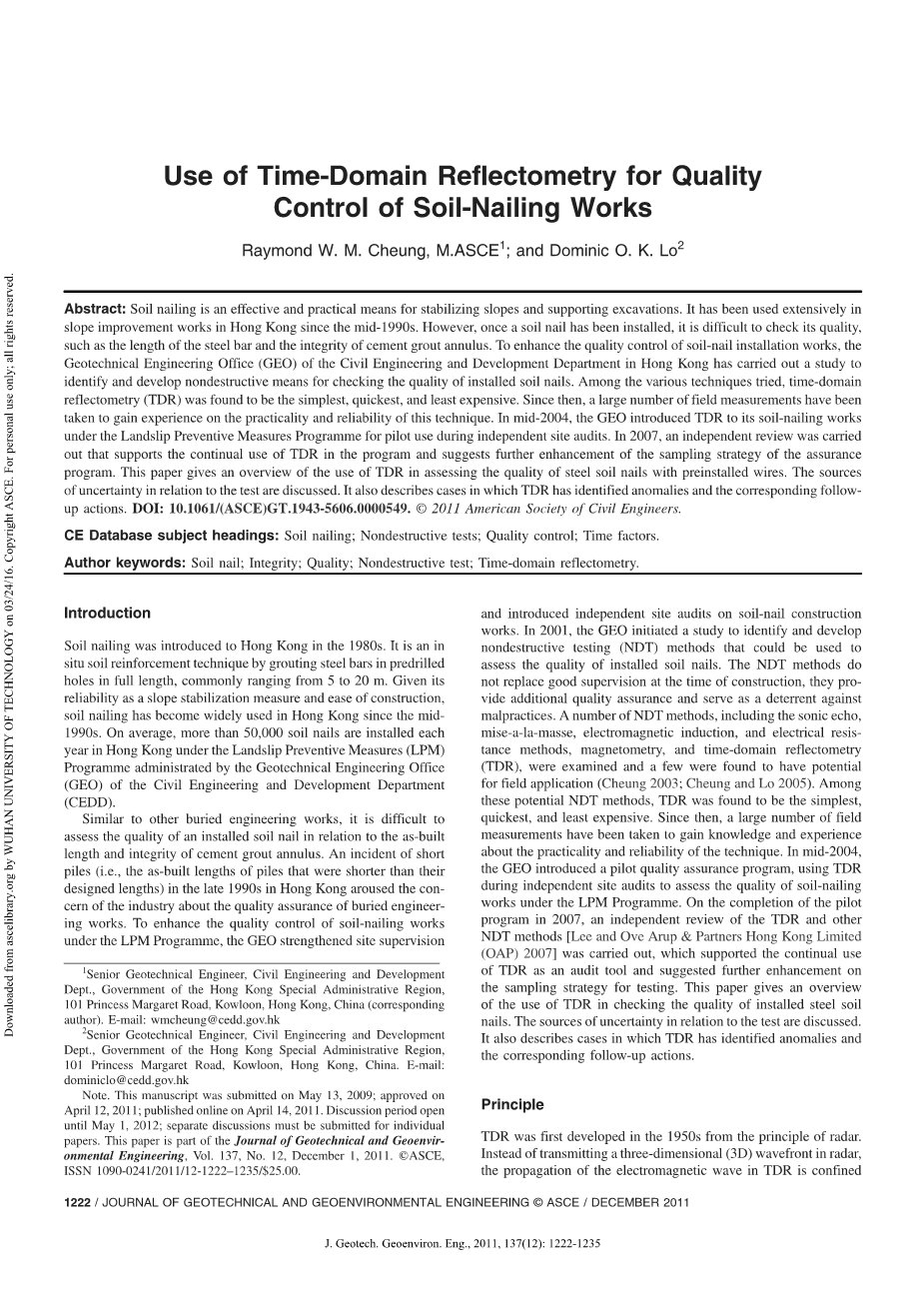 类似于其他掩埋工程工作,难以以安装土钉的关系质量评估竣工长度和水泥灌浆环的完整性。短期事件桩(即桩已建成的长度小于设计长度)在香港90年代末引起关注业内有关埋工程质量保证作品。为了提高土钉工程的质量控制,根据防止山泥倾泻计划,土力工程处对土钉施工作品加强现场监督并推出独立的现场审核。 2001年,GEO发起了一项研究,以确定和发展可用于无损检测(NDT)方法评估安装土钉的质量。但无损检测方法在施工时不能良好的监督,他们提供额外的质量保证,并作为对于弊端的一种威慑。许多无损检测方法,包括声波回声,濑-一拉集体,电磁感应和电阻方法,磁力和时域反射计(TDR),进行了检查,发现了一些有潜力的现场应用。其中这些潜在的无损检测方法,TDR被发现是最简单的,最快和最便宜的。自那时以来,关于该技术的实用性和可靠性,采取大量的现场测量来获得知识和经验。在2004年年中,土力工程处推出一个试点质量保证计划,根据防山泥倾泻计划工作,采用TDR独立的现场审核来评估土钉的质量。计划在2007年完成试点,TDR等进行独立审查无损检测方法[李和奥雅纳工程顾问香港有限公司(OAP)2007]进行,其中支持继续使用TDR作为审计工具和建议进一步加强对抽样策略进行测试。本文给出了一个利用TDR检查安装钢土钉质量的的案例。对测试不确定性进行了讨论。它也描述了TDR已经确定异常和案例相应的后续行动。