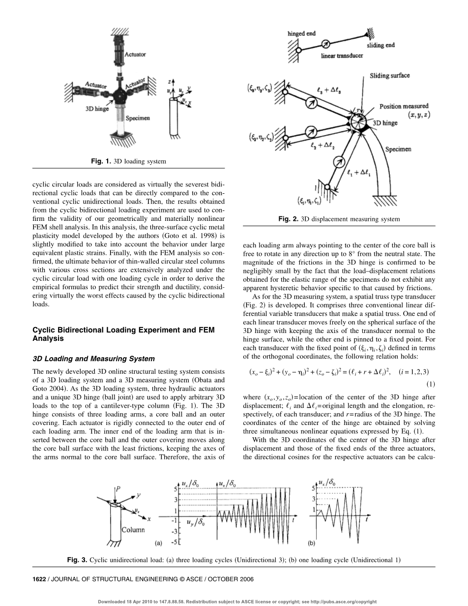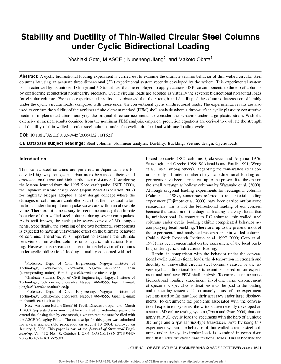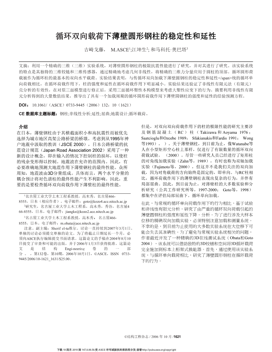 循环双向载荷下薄壁圆形钢柱的稳定性和延性外文翻译资料