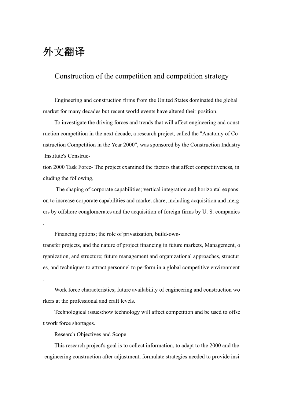 To investigate the driving forces and trends that will affect engineering and construction competition in the next decade, a research project, called the 'Anatomy of Construction Competition in the Year 2000', was sponsored by the Construction Industry Institutes Construc-tion 2000 Task Force- The project examined the factors that affect competitiveness, including the following,
