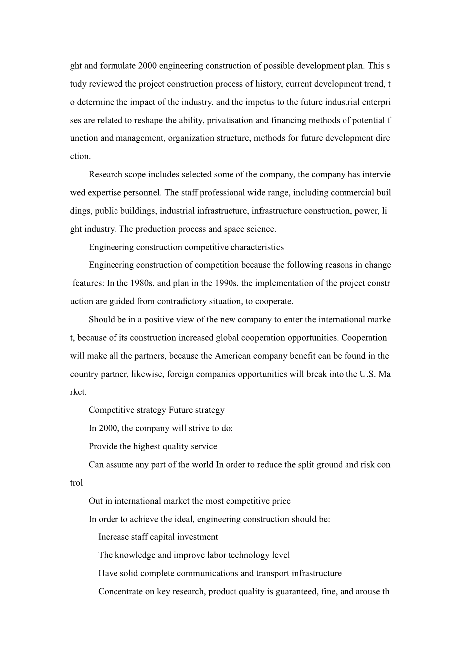 This research projects goal is to collect information, to adapt to the 2000 and the engineering construction after adjustment, formulate strategies needed to provide insight and formulate 2000 engineering construction of possible development plan. This study reviewed the project construction process of history, current development trend, to determine the impact of the industry, and the impetus to the future industrial enterprises are related to reshape the ability, privatisation and financing methods of potential function and management, organization structure, methods for future development direction.