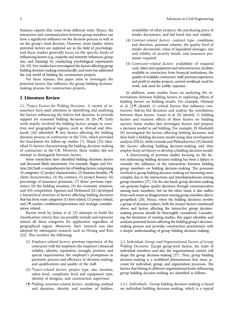在施工管理(CM)相关的先前研究[6-10]中广泛关注招标决策和相关过程中的因素。然而,这些研究的重点主要是项目特征、建筑公司的可用资源以及市场条件等经济环境因素。研究在很大程度上忽略了群体决策中个体成员之间关于可用项目机会、投标/不投标和投标价格的相互作用。