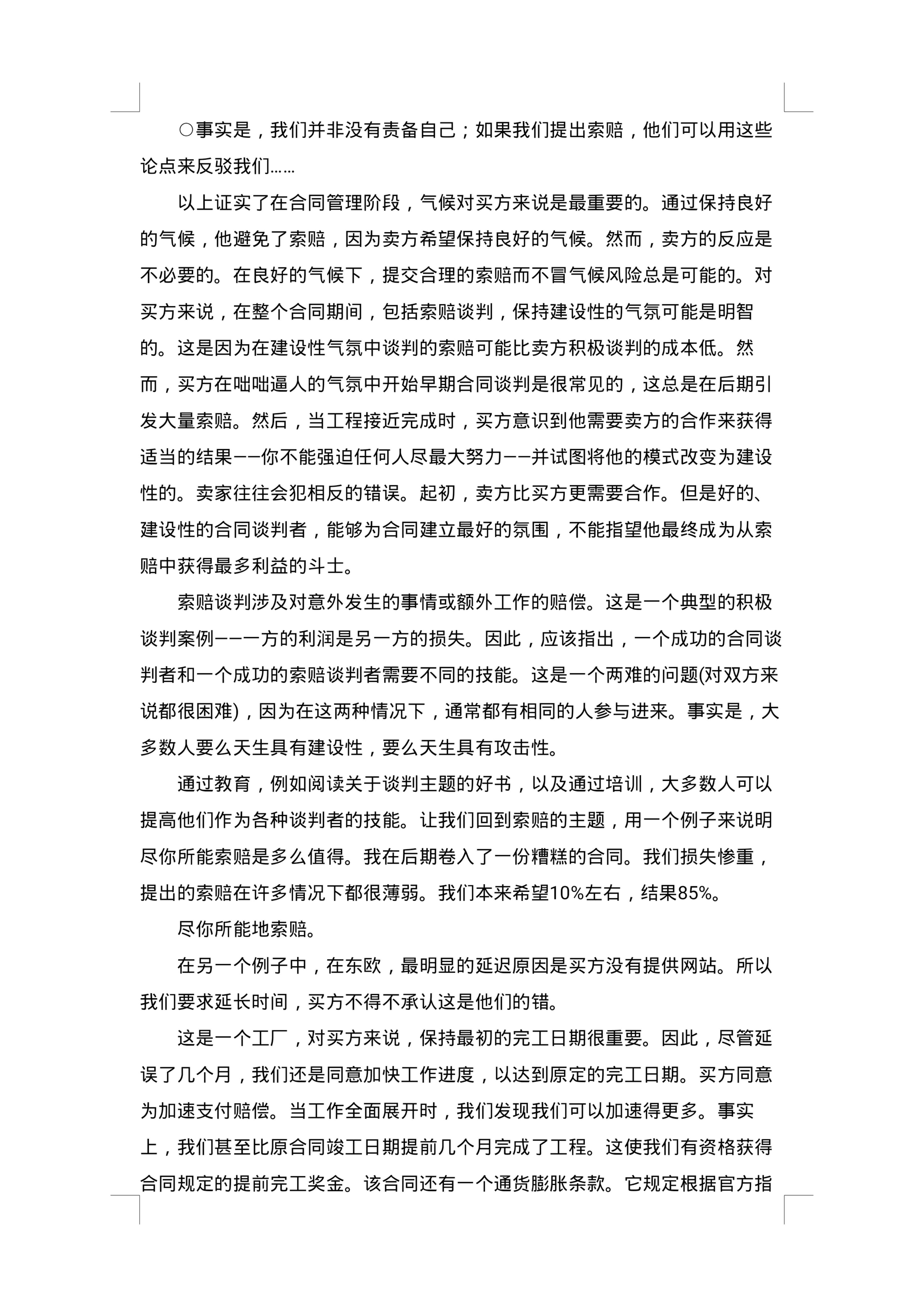 By education, such as reading good books on the subject of negotiations, and by training, most people can however improve their skills as negotiators in all styles. Lets return to the subject of claims with an example of how it pays to claim all you can. I was involved at a late stage in a bad contract. We were losing heavily and put in claims which were weak in many cases. We originally hoped for about 10% and ended up with 85%.