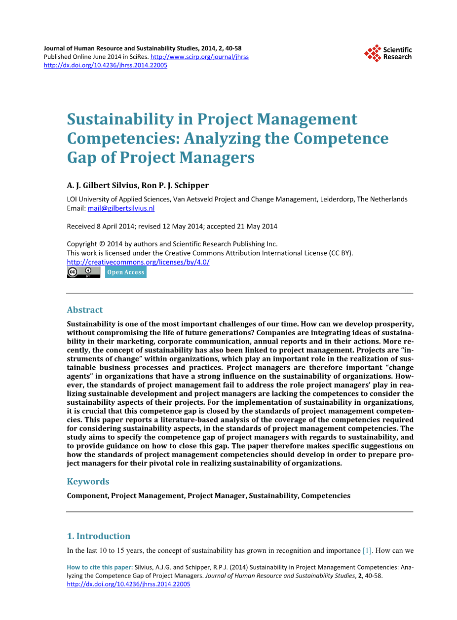 在过去的10到15年里,可持续发展的概念得到了越来越多的认可和重视。如何引用本文:Silvius, A.J.G.和Schipper, r.p.j(2014)项目管理能力的可持续性:分析项目经理的能力差距。人力资源与可持续发展研究,2,40-58。