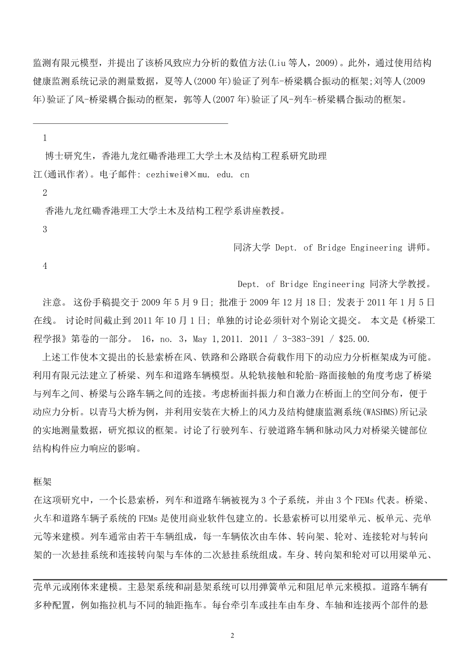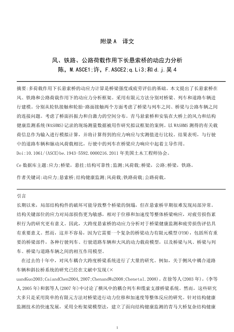 风、铁路、公路荷载作用下长悬索桥的动应力分析外文翻译资料