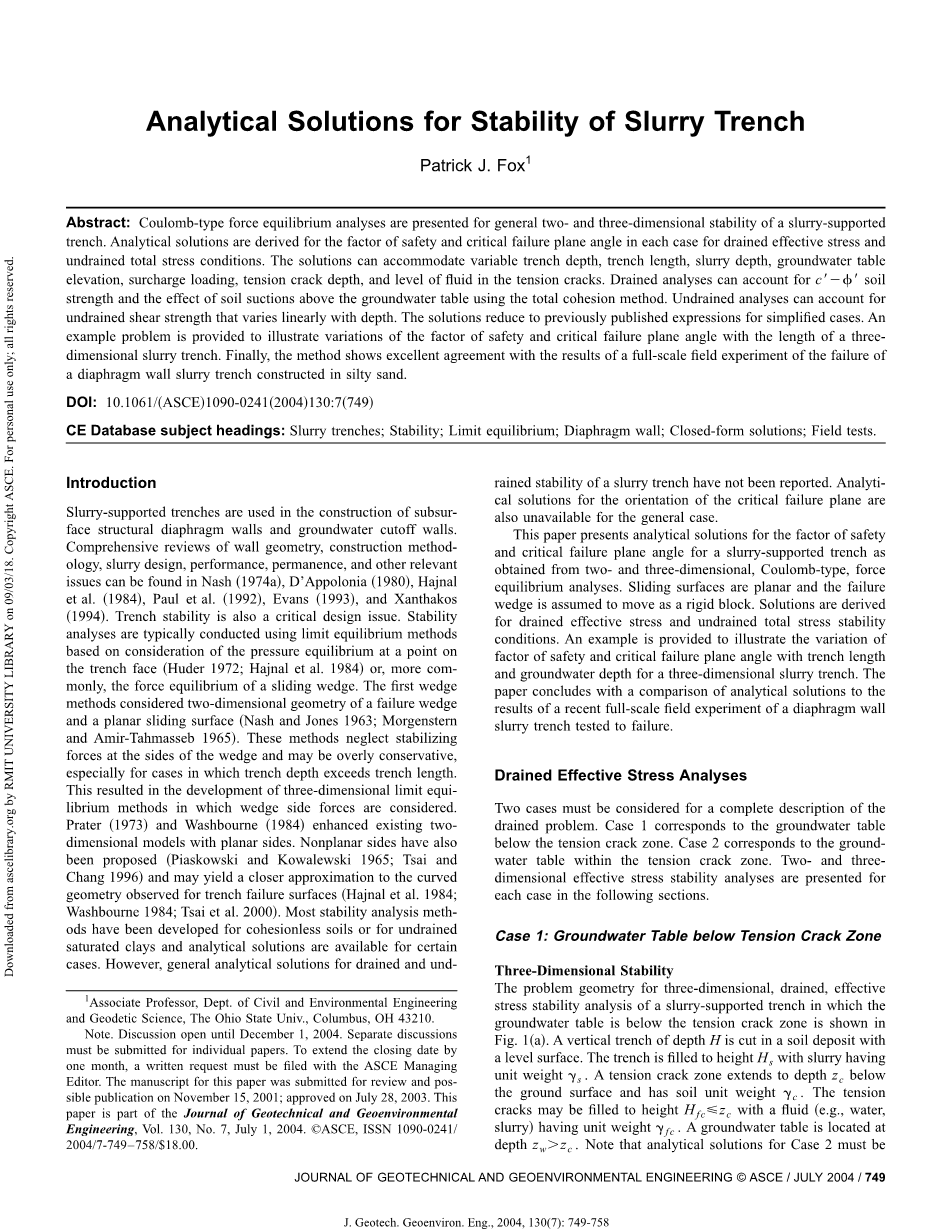 本文从二维和三维、库仑模型、力学平衡分析得到的泥浆槽壁安全系数和临界破坏面角的解析解。滑动面假定为平面,破坏的楔体假定为刚性移动。以此给出了排水有效应力和不排水总应力稳定条件的解;给出了三维泥浆槽壁安全系数和临界破坏平面角随沟槽长度和地下水深度的变化规律。本文最后比较了分析解决方案与最近一个泥浆槽壁进行的全面现场试验的结果。