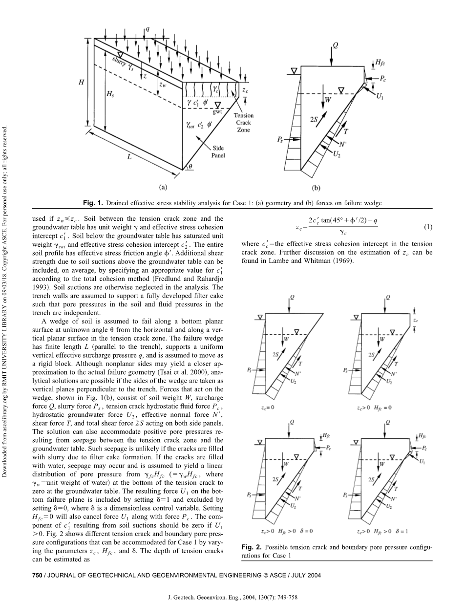 假定土楔体从水平沿未知角度u沿底部平面表面失效,并沿张力裂纹区的垂直平面表面失效。破坏楔体的有限长度平行于沟槽,均匀的垂直力有效附加在上面为Q,并假定移动楔体为刚性块。虽然非平面侧可能产生一个更接近实际破坏的情况(Tsai等人)。 如果把楔体的两边看作垂直平面,那么解析解是可能垂直于泥浆槽壁的。作用在楔形体上的力,如图所示1(b),由土重W、堆载力Q、泥浆力Ps、张力裂缝静水流体力Pc、静水地下水力U2、有效法向应力N8,剪切力T,总剪切力2S作用于两侧面板。该流体还可以容纳由于张力裂缝区与地下水位之间的渗流而产生的正孔隙水压力。如果裂缝由于过滤体的形成而充满泥浆,这种渗流是不可能存在的。如果裂缝中充满了水,可能会发生渗流,并假定产生来自(,其中为单位重量的水)线性分布,且在地下水位处的张力裂纹底部处为零。 在底部失效平面上产生的力U1通过包括在内,并通过设置排除,其中是无量纲控制变量。 设置在U1gt;0的情况下也会取消U1的受力。图1通过改变参数zc、Hfc和d,图2显示了不同的拉伸裂纹和边界孔隙压力构型,可以适应情况1。 拉伸裂纹的深度可以估计为