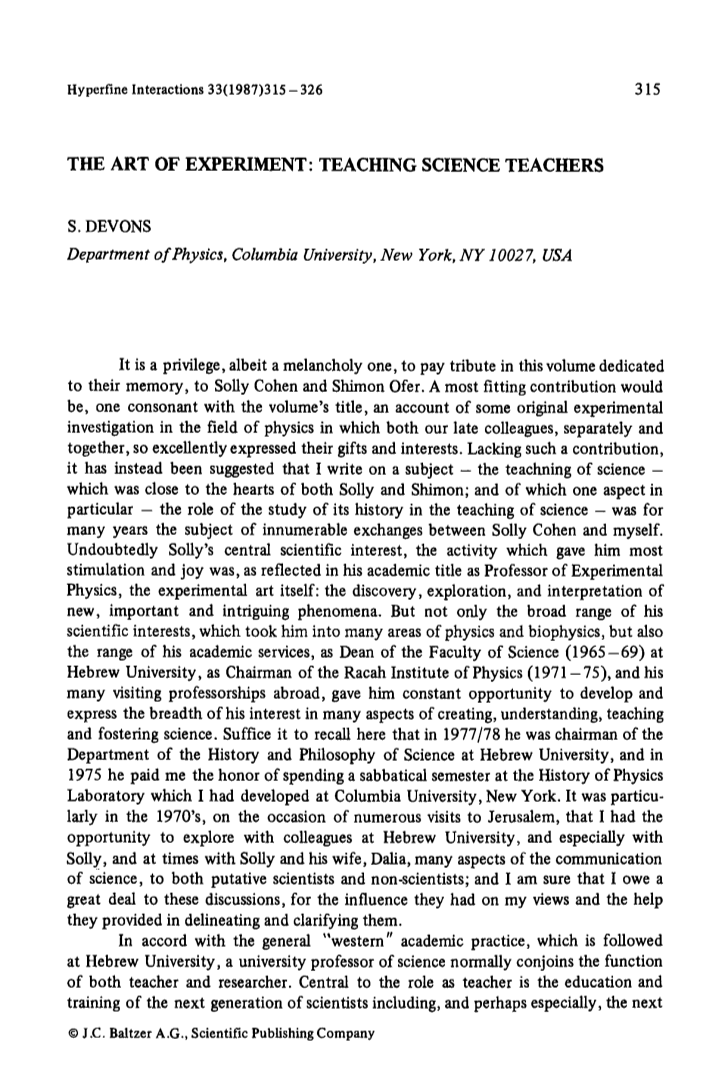 我很荣幸在这本书中向索莉·科恩和希蒙-奥费尔致敬, 尽管令人感到忧伤——他们将定格于记忆之中。我们已故的同事,对于这个物理学的领域实验调查中表现出了如此崇高的兴趣和作出了贡献,而这就是同标题所一致的。由于我没有这样的贡献, 有人建议我写一个主题, 即科学的教学——这是接近索利和世蒙的初心的,而其中一个特别的方面研究其历史在科学教学中的作用多年来一直是索莉·科恩和我之间无数交流的主题。毫无疑问, 索利的科学兴趣的中心,反映在他的学术标题,作为实验物理教授,并给他自己带来快乐和喜悦的活动, 那就是实验本身: 发现, 探索和解释新的事物和现象。他的兴趣带领他进入了广泛的物理学和生物物理学的许多领域,而且还在他的学术服务范围提供了一定的作用,作为希伯来大学理学院院长(1965年至69年)的主席, Racah物理研究所(1971年至75年)和他在国外的许多访问教授,使他有机会在创造,理解,教学和培养科学的许多方面发展和表达他的这一兴趣。我在这里仅作一次简单的回顾,在 1977年, 他曾是希伯来大学科学历史和哲学系的主席的时候, 1975年, 他给予我在纽约哥伦比亚大学的物理史实验室开创工作一个学期的荣誉机会。在20世纪70年代,在多次访问耶路撒冷之际,我曾多次获得与在希伯来大学的同事们探索的机会,特别是索利与他的妻子达莉亚,在对科学的很多方面通信研究了很多次,这些经历影响到了我后来的观点、理念和描述澄清等方面提供了帮助。
