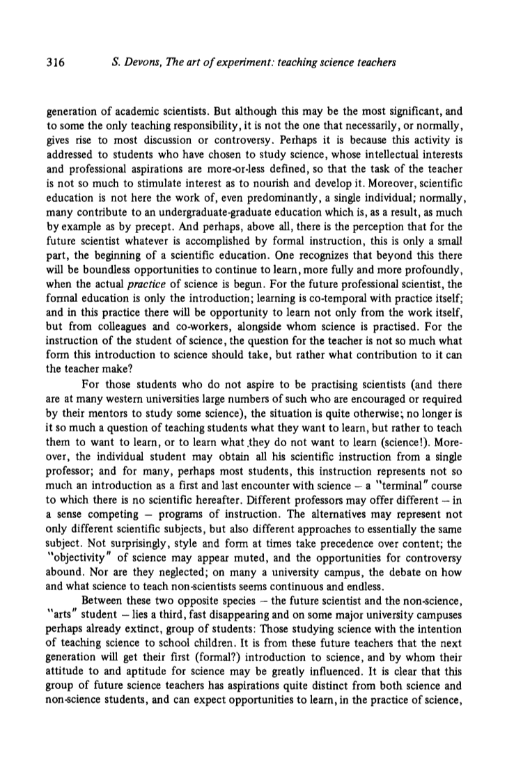 在这两个相反的专业之间, 未来的科学家和非科学专业的学生, 剩余的学生是三分之一, 而这些学生正在迅速消失, 在一些主要大学校园里甚至可能已经完全消逝的, 一群学生: 那些以教学为目的学习科学的学生科学给在校学生。正是从这些未来的老师那里,将获得他们的下一代第一个 (正式?) 科学入门, 从中他们对科学的态度和能力可能会受到很大影响。显然, 这群未来的科学教师的愿望与科学和非科学专业的学生有很大的不同, 会期待着有机会在科学实践中学习, 但是他们与有抱负的实践科学家的愿望完全不同:也许是因为, 在许多主要的学术机构, 这个群体已经变得难以理解的,学者们表达对学校科学教学的兴趣已成为一种时尚, 因为他们关心的不是如何 (未来)教师学习科学, 而是他们应该教什么, 他们应该如何教它。这对大学学者来说是否合适是一个值得商榷的问题 (索莉·科恩和我在这个问题上进行了很多长时间的讨论); 但向教师教授科学的责任 (如果他们的存在是可以识别的) 是大学学者的责任, 这一点是没有争议的。如果不适合, 这是谁的责任?(我在这里假设的是 '西方' 背景, 即在大学一级, 学术科学没有尖锐的分叉进入 '教育学' 和 '科学' 分支)。