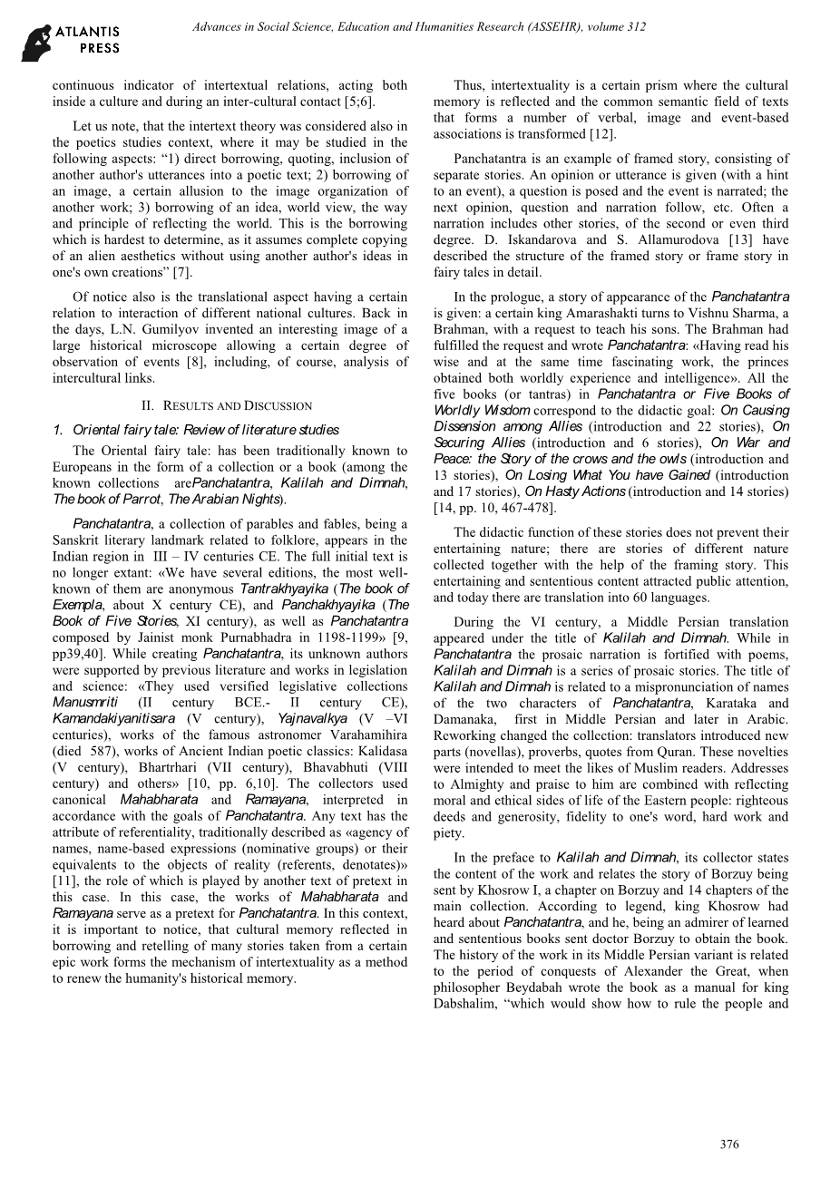 panchatantra是一个寓言和寓言的集合,是一个与民间传说有关的梵文文学地标,出现在公元前3-4世纪的印度地区。完整的初始文本不再存在:我们有几个版本,其中最著名的是匿名TANTRAKHYAYIKA(EXPLA,大约X世纪CE),和Panchakhyayika(五本书,世纪),以及耆那教僧侣Purnabhadra于1198-1199年创作的《班禅曲》[9,第39、40页]。在创作潘查塔拉的同时,其未知的作者也得到了立法和科学领域以前的文献和著作的支持:“他们使用了版本化的立法收藏品曼努什穆提(公元前二世纪至公元前二世纪)、卡曼达基亚尼蒂萨拉(公元五世纪)、亚纳瓦基亚(公元五世纪至公元六世纪)。”著名天文学家瓦拉哈米希拉(死于587年)的作品,古代印度诗学经典作品:卡里达萨(公元五世纪)、巴特拉里(公元七世纪)、巴瓦布提(公元八世纪)和其他作品。收藏家们使用了正典的《摩诃婆罗多》和《罗摩衍那》,按照《班禅》的目标来解释。任何文本都具有指称性,传统上被描述为“名称的代理、基于名称的表达式(命名组)或它们与现实对象(指称、表示)的等价物”[11],在这种情况下,另一个借口文本发挥了这种作用。在这种情况下,摩诃婆罗多和罗摩衍那的作品就成了班禅的借口。在这一背景下,需要注意的是,借用和重述某一史诗作品中的许多故事所反映的文化记忆形成了互文性机制,作为人类历史记忆更新的一种方法。 因此,互文性是反映文化记忆的一个棱镜,它改变了文本共同的语义场,形成了许多基于语言、图像和事件的联想。