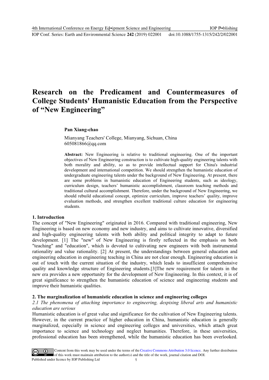 Research on the Predicament and Countermeasures of College Students Humanistic Education from the Perspective of “New Engineering”
