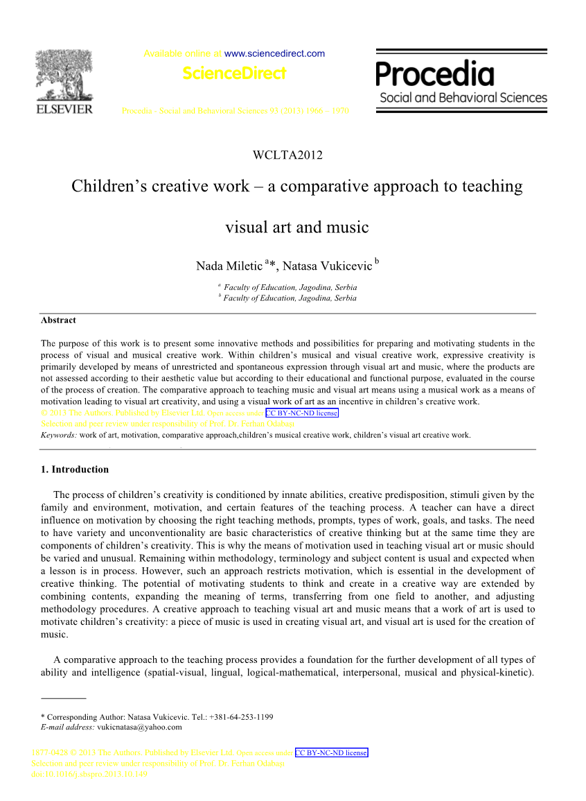 儿童创作——关于视觉艺术和音乐的教学比较方法外文翻译资料