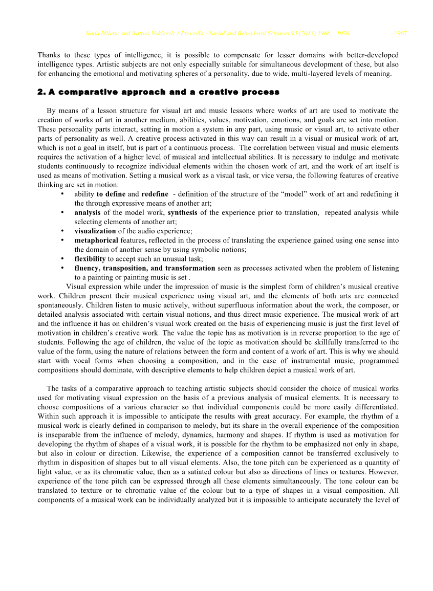 儿童创造力的过程受到先天能力、创造性倾向、家庭和环境的刺激、动机和教学过程的某些特征的制约。教师可以通过选择正确的教学方法、提示、工作类型、目标和任务对动机产生直接影响。创造性思维的基本特征是多样性和非常规性,但同时也是儿童创造力的组成部分。这就是为什么在视觉艺术或音乐教学中使用的动机手段应该是多样和不同寻常的。当一节课正在进行时,术语和主题内容仍然保留在方法、术语和主题内容中是很常见的。然而,这种方法限制了动机,这对创造性思维的发展至关重要。通过整合内容、拓展词汇意义、从一个领域向另一个领域转移、调整方法论程序,激发学生以创造性方式思考和创造的潜力得到了拓展。视觉艺术和音乐教学的一种创造性方法,是指用一件艺术作品来激发儿童的创造力:用一件音乐来创作视觉艺术,用视觉艺术来创作音乐。