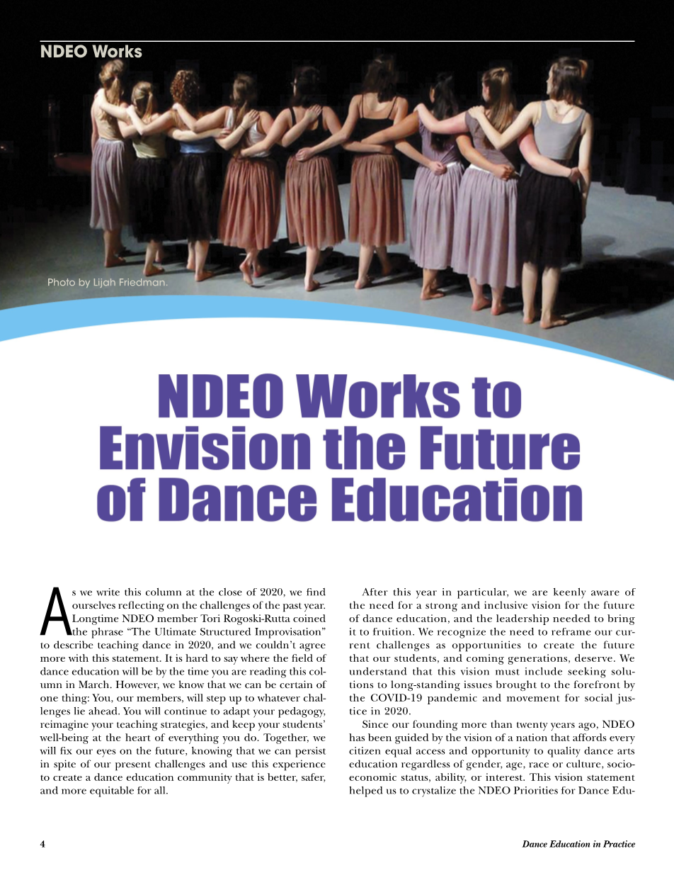 当我们在 2020 年结束时撰写本专栏文章时,我们发现自己反思了过去一年的挑战。长期 NDEO 成员托里·罗格斯基-鲁塔创造了“终极结构化即兴表演”一词来描述 2020 年的舞蹈教学,我们完全同意这一说法。当你在三月份阅读这篇专栏文章时,很难说舞蹈教育领域会在哪里。然而,我们知道我们可以确定一件事:你,我们的成员,将迎接面前的任何挑战。你将继续调整教学法,重新想象你的教学策略,并将学生的福祉保持在你所做一切的核心。我们将共同关注未来,因为我们知道,尽管我们目前面临挑战,我们仍然可以坚持下去,并利用这一经验创建一个对所有人都更好、更安全和更公平的舞蹈教育社区。