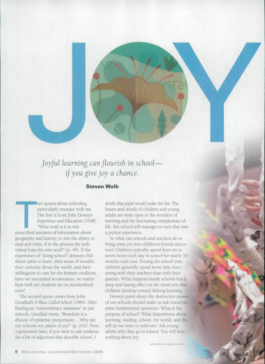 关于学校教育的两句话特别引起我的共鸣。第一个是来自约翰·杜威的《经验和教育》(1938):“如果在这个(学校教育)过程中,个人失去了自己的灵魂,那么获取课标规定的地理和历史信息和获得阅读和写作的能力有什么用?”。如果“上学”的经历摧毁了孩子们的学习精神、好奇心、对世界的好奇心和关心人类状况的意愿,那么抛开我们的学生在标准化考试中的表现不说,我们作为教育者是否成功了呢?