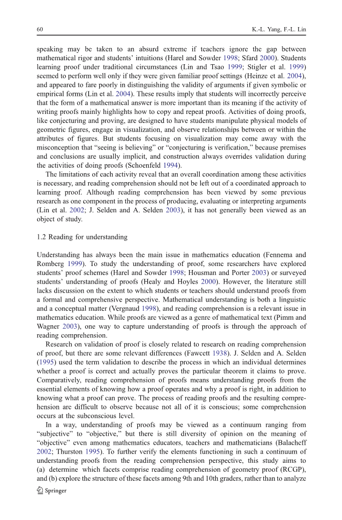 每个活动的局限性表明,这些活动之间必须有一个整体的协调,并且不应将阅读理解排除在协调的学习证明方法之外。尽管先前的一些研究认为阅读理解是产生、评估或解释论证过程中的一个组成部分(Lin等,2002,J.Selden和A.Selden,2003),但它通常不被认为是阅读的对象研究。