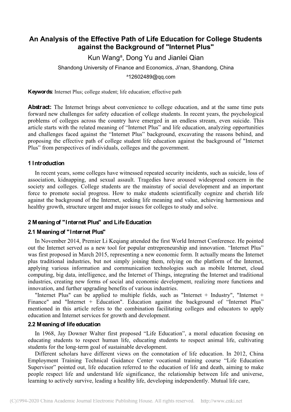 “互联网 ”背景下大学生生命教育的有效路径分析外文翻译资料