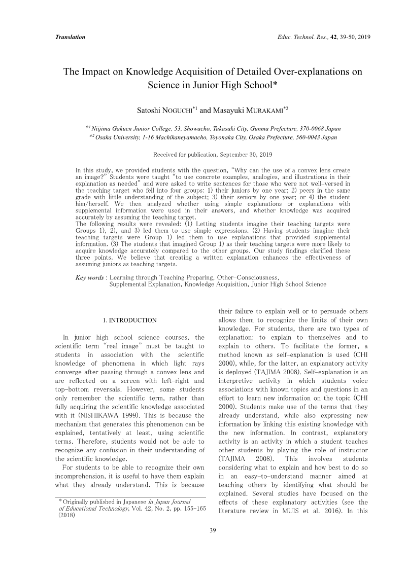 摘要:在这项研究中,我们向学生提出了一个问题,“为什么凸透镜能产生图像?”学生们被教导“在他们的解释中需要使用具体的例子、类比和插图”,并被要求为那些不熟悉教学目标的人写句子,这些人分为四组:1)比他们小一岁的学生;2)同年级的同学但对该学科的理解很少;3)比他们年长一岁的学生;4)学生本人。然后分析通过设置教学对象他们的回答是使用了简洁的解释还是补充信息的解释,以及他们是否准确地获取了知识。结果显示:(1)让学生想象自己的教学对象为1)、2)、3)组时,引导学生使用简单的表达方式。(2)让学生想象他们的教学对象是1)组时,引导他们使用提供补充信息的解释。(3)以第一组为教学对象的学生较其他组更容易获得准确的知识。我们的研究结果阐明了这三点。我们相信创建书面解释可以提高以大三学生为教学目标的有效性。(小四,宋体)