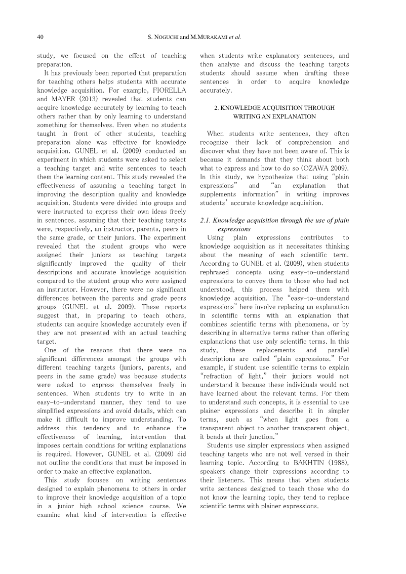 在本研究中,学生被要求按照写作条件为那些不熟悉主题的学生书写解释文本。他们被要求想象的教学对象是:1)比他们小一岁的学生;2)同年级的同学但对该学科的理解很少;3)比他们年长一岁的学生;4)学生本人。由于学生认为他们的听众缺乏必要的知识,他们不得不用间接地表述书写句子。另外由于学生被要求符合写作条件,那些想象比他们小一岁学生作为教学对象的学生比想象其他教学对象的学生更有可能使用带有补充信息的解释。我们猜想那些使用简洁表述方式并写下补充信息解释的学生比那些不使用补充信息的学生更有可能准确地获取知识。因而在本研究中,我们建立了一个假设:“如果学生比他们小一岁学生想象为教学对象,他/她就会生成一种补充信息的解释,从而准确地获取知识。”我们报告了学生解释的质量,我们的分析结果将重点关注以下三点:1)想象教学对象是否有利于简洁表达的使用;2)在不同教学对象组中,哪一组的学生写补充信息解释的比例最高;3)喜欢用高度重复句子的那组是否比不喜欢的那组获得了更准确的知识。然而这些分析并没有揭示影响两组之间差异的因素,因此我们采访了1)、2)、3)小组,并继续讨论基于这些采访的因素。