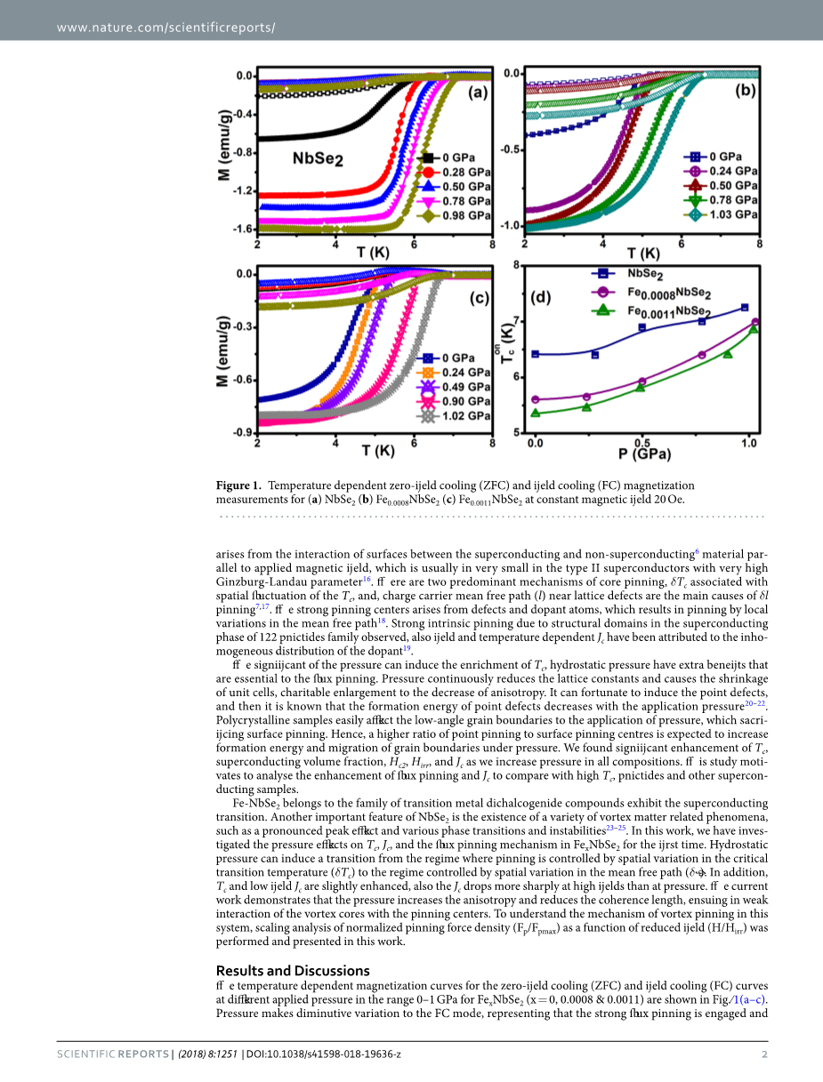 Fe-NbSe2属于过渡金属二氯化物化合物家族,表现出超导转变。NbSe2的另一个重要特征是存在各种与涡流物质有关的现象,如明显的峰值效应和各种相变和不稳定性23-25。在这项工作中,我们首次研究了压力对FexNbSe2中Tc、Jc和通量钉住机制的影响。静水压力可以诱发从由临界转变温度(delta;Tc)的空间变化控制的钉牢制度过渡到由平均自由路径(delta;ℓ)的空间变化控制的制度。此外,Tc和低场Jc略有增强,同样,Jc在高场时比压力时下降得更厉害。目前的工作表明,压力增加了各向异性,减少了相干长度,从而导致涡旋核心与钉子中心的弱相互作用。为了理解该系统中涡旋钉扎的机制,本工作对归一化钉扎力密度(Fp/Fpmax)作为还原场(H/Hirr)的函数进行了比例分析。