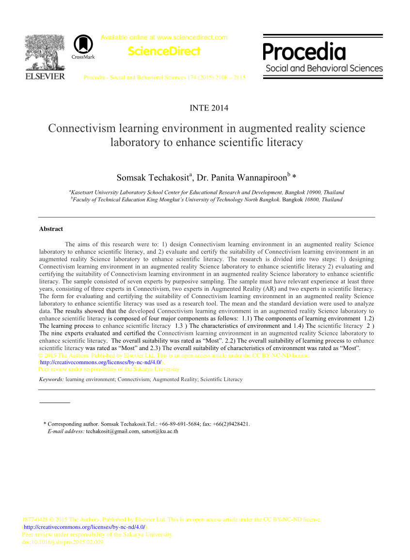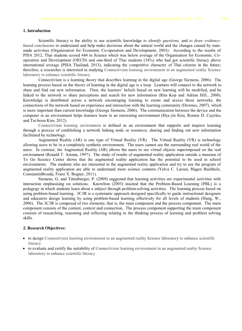 科学素养是指利用科学知识来识别问题,并得出基于证据的结论来理解和帮助做出关于自然世界和人类活动造成的变化的决定的能力(经济合作与发展组织,2003年)。根据PISA 2012的调查结果显示,泰国学生的科学成绩为444分,这低于经济合作与发展组织(经合组织)的平均水平,但三分之一(34%)泰国学生的科学素养高于国际平均水平(PISA泰国,2013),这也表明了泰国公民在未来的竞争特性;因此,本研究有意于研究在增强现实科学实验室中能够提高科学素养连接主义学习环境。